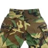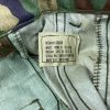 M-65 camo field trousers. 6-pockets and zipper front. The waist band has sewn-in cotton loops for suspender.  These are the military issue fatigue trousers that are designed to accept a button-in liner, just like the field jacket. Woodland camouflage pants that are made of 50% cotton and 50% nylon. The fabric is wind-proof, and they will also shed water and snow fairly well. The pants are full fitting in order to allow a liner to be added. The military issued these for intermediate cold environment as a supplement to the BDU’s. These are in new condition with maybe a slight amount of shelf-wear from storage and packing. They fit just like the BDU in waist and length, but they are just very roomy in the legs. The pockets have a snap so that your valuables will not accidentally fall out into the snow and be lost. Also, the side thigh pockets feature a leg tie strap so that heavy loads can be secured and not beat you up as you take a long march.