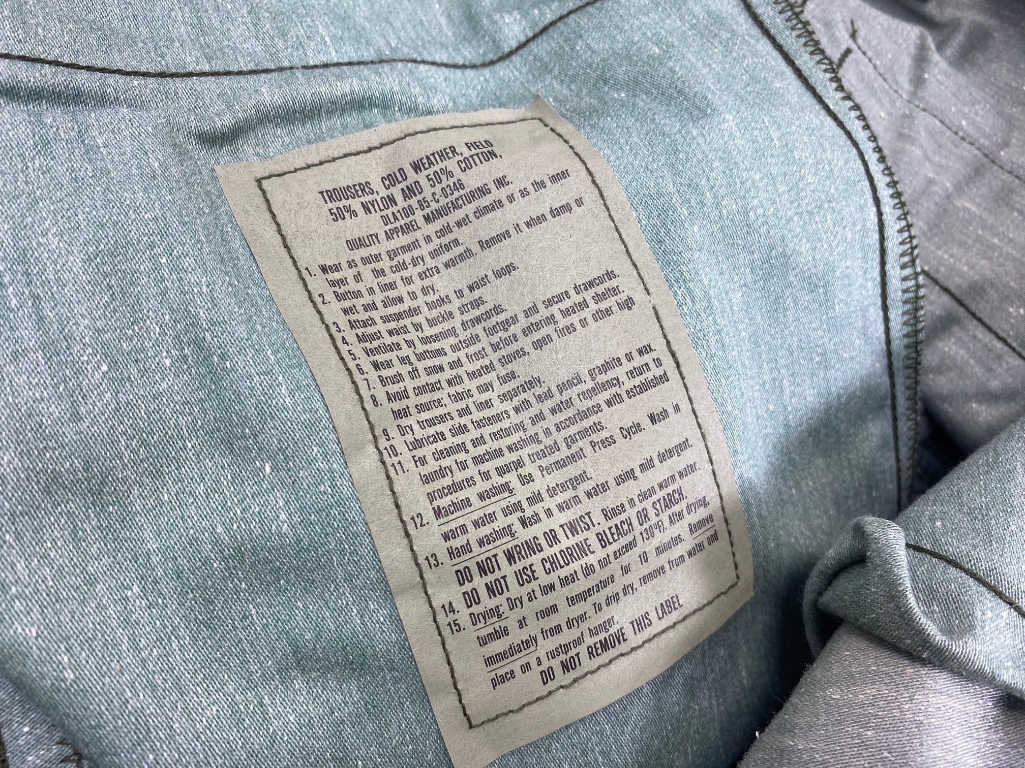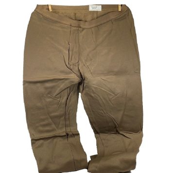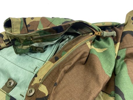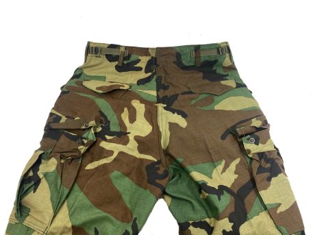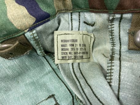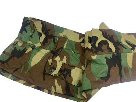 M-65 camo field trousers. 6-pockets and zipper front. The waist band has sewn-in cotton loops for suspender. These are the military issue fatigue trousers that are designed to accept a button-in liner, just like the field jacket. Woodland camouflage pants that are made of 50% cotton and 50% nylon. The fabric is wind-proof, and they will also shed water and snow fairly well. The pants are full fitting in order to allow a liner to be added. The military issued these for intermediate cold environment as a supplement to the BDU’s. These are in new condition with maybe a slight amount of shelf-wear from storage and packing. They fit just like the BDU in waist and length, but they are just very roomy in the legs. The pockets have a snap so that your valuables will not accidentally fall out into the snow and be lost. Also, the side thigh pockets feature a leg tie strap so that heavy loads can be secured and not beat you up as you take a long march.