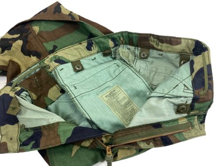 M-65 Camo Field Trousers, New. Original Military Issue. All new. Similar to BDU except these are cut larger to accommodate the optional button in liner. Made from heavy cotton poly poplin. Water and wind resistant. Features the leg pocket tie straps to help you secure heavier loads. M-65 camo field pants. Size Medium Regular.
