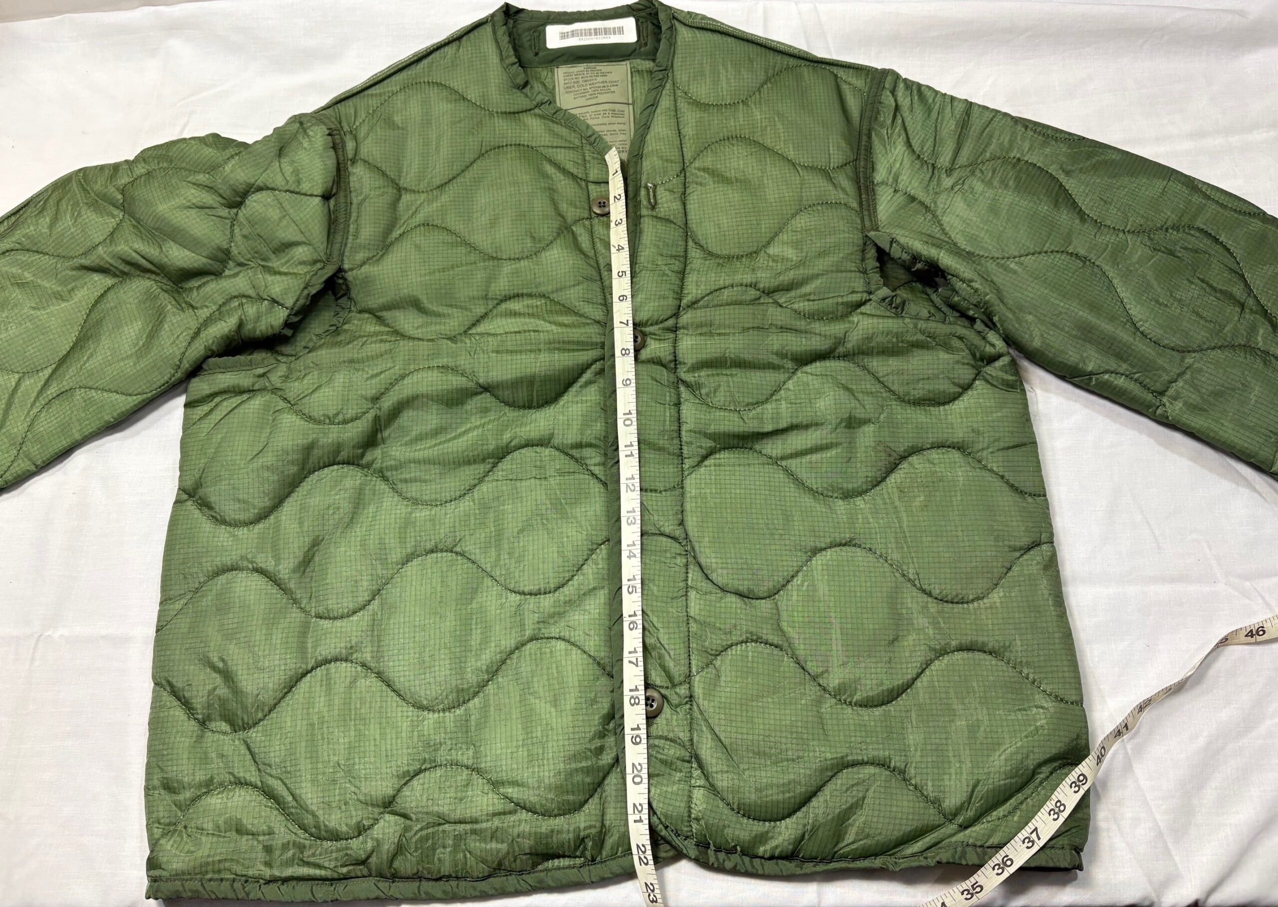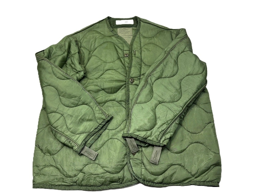 Original issue military M-65 field jacket liners size Large. Color will be standard Olive Drab shades. Some light some dark. While NEW in condition, *Note*- these are factory irregulars! Missing 1 or more sleeve tabs to button into M-65 field jacket.