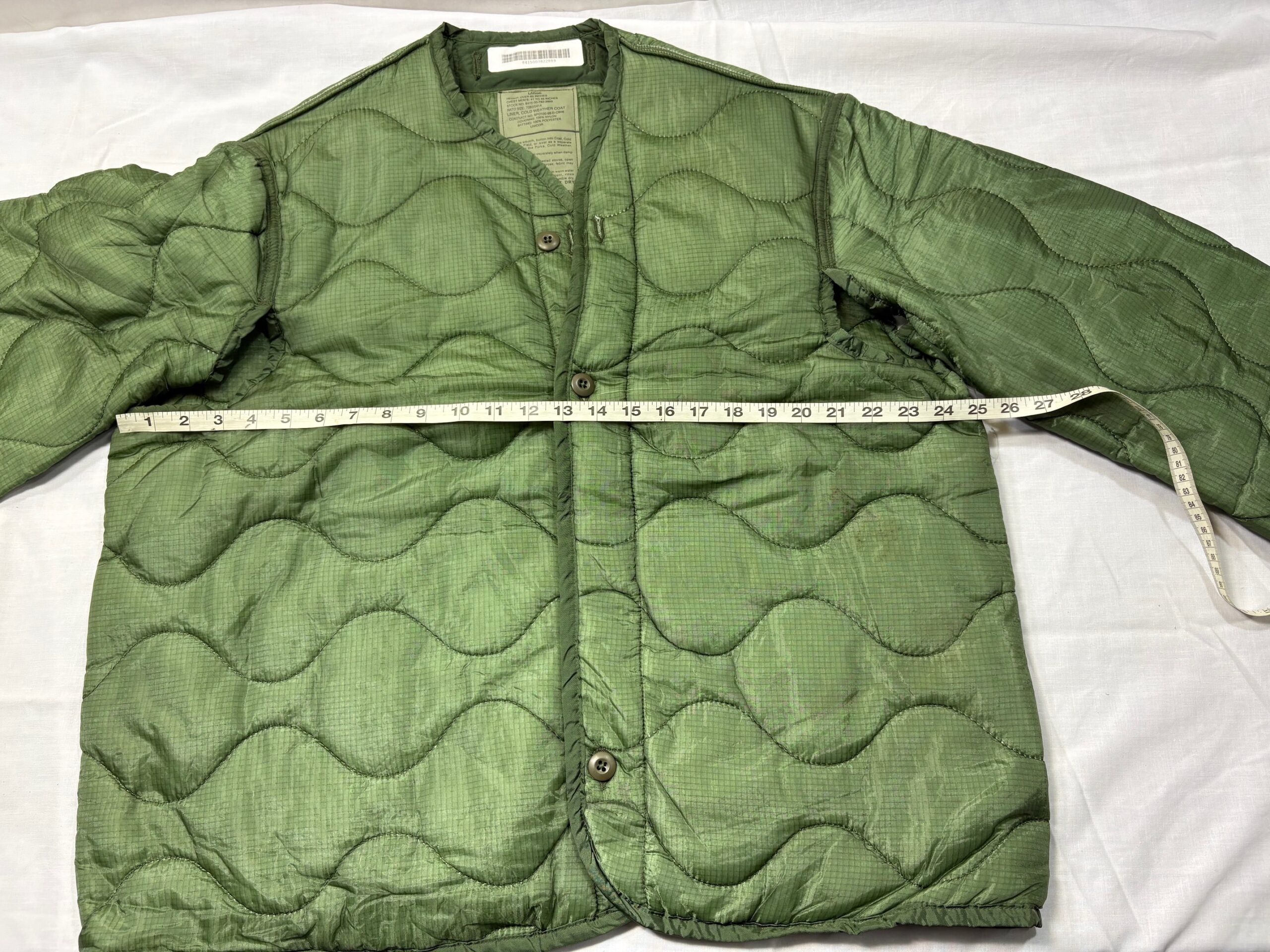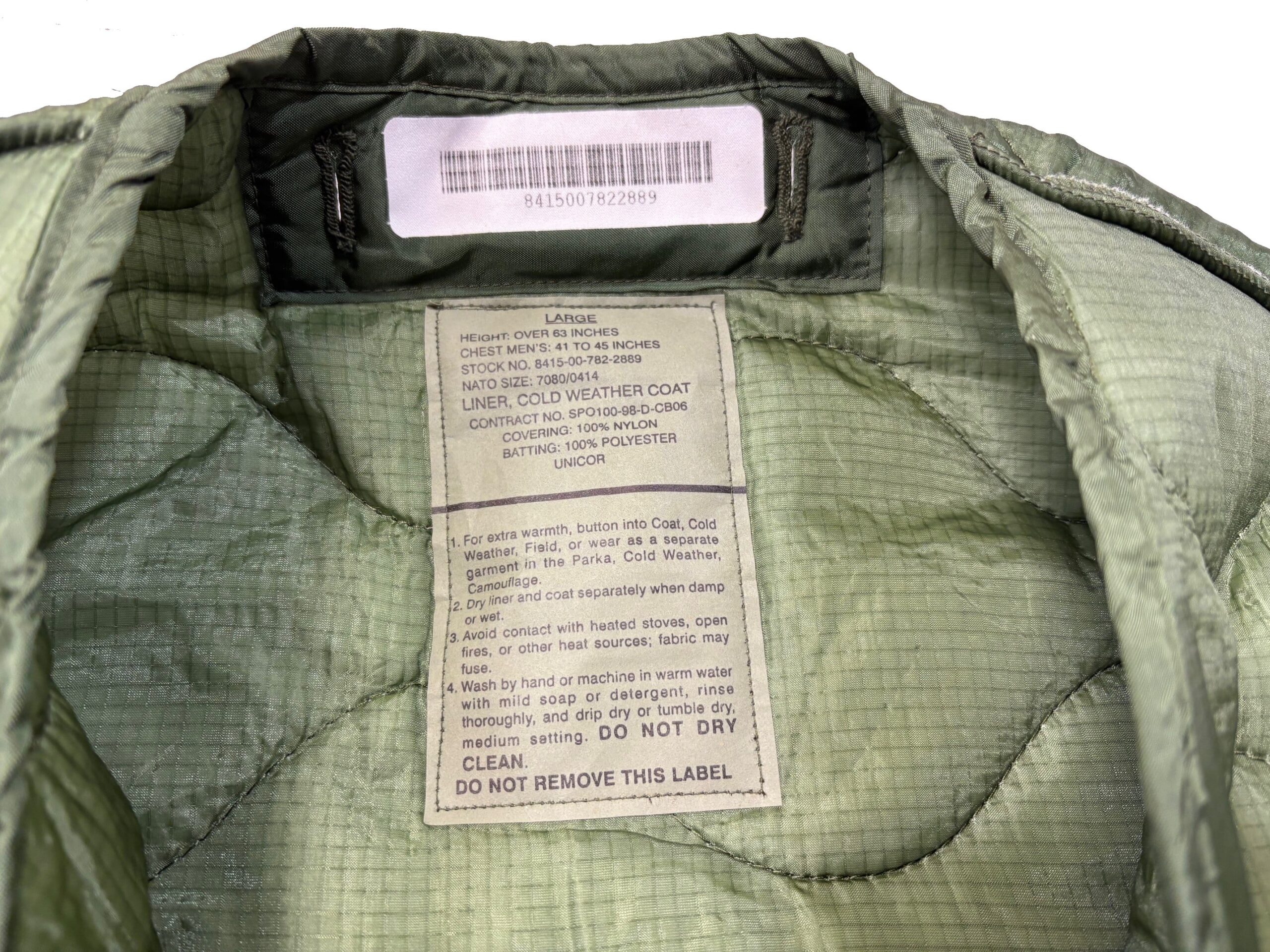 Military issue. Nylon with polyester batting. factory irregulars, missing sleeve tabs.