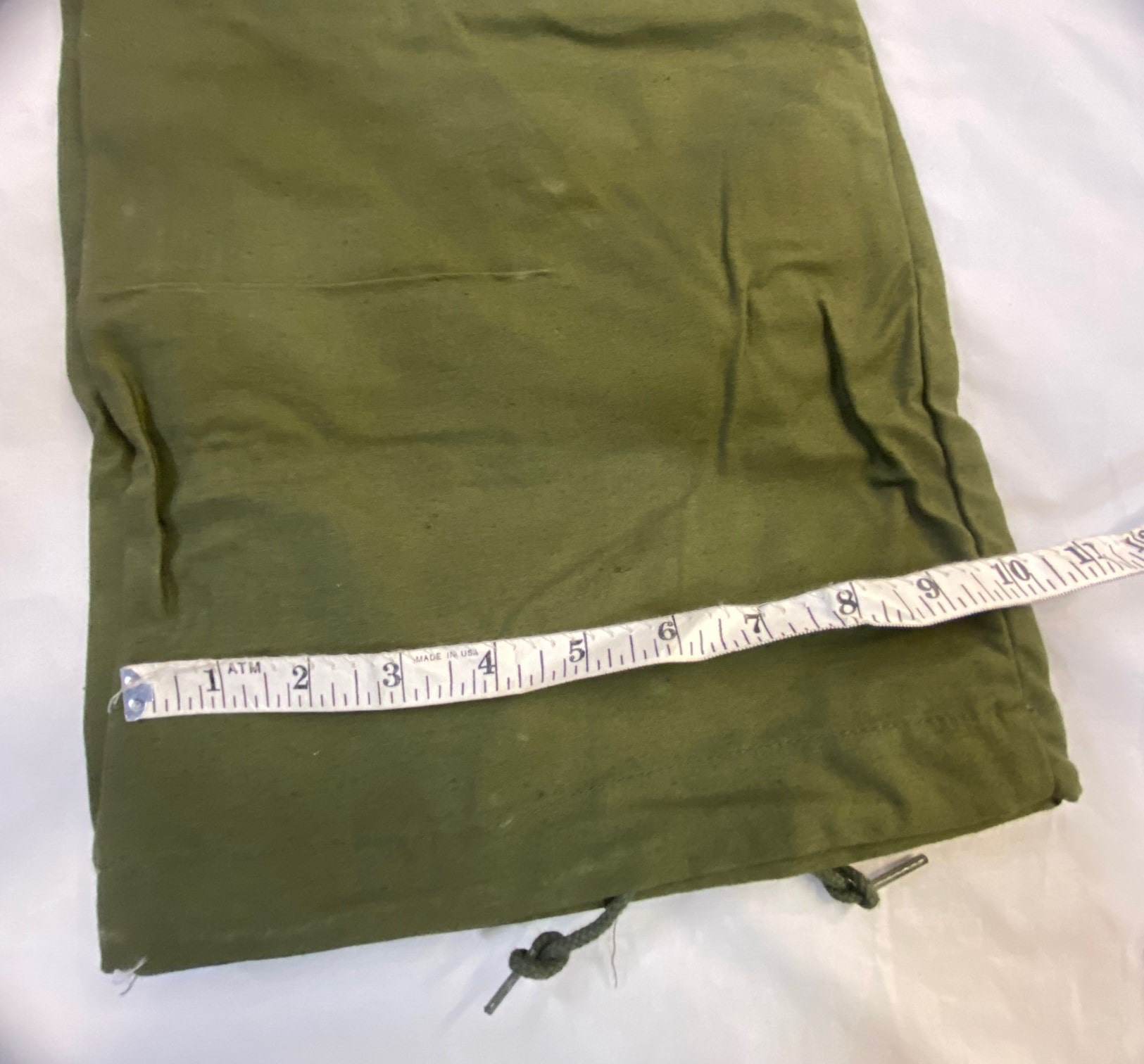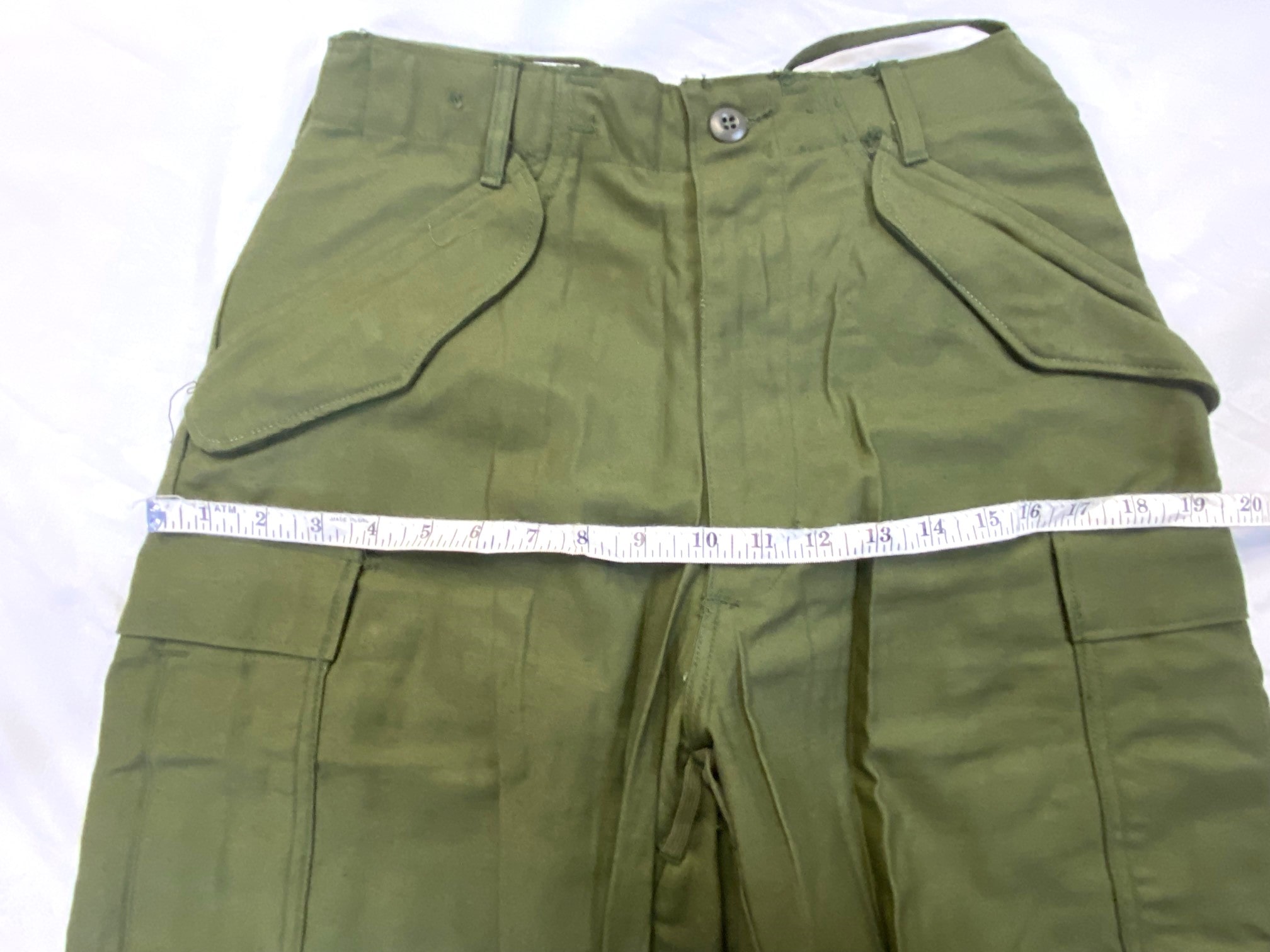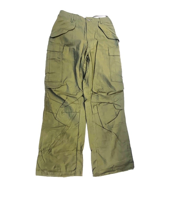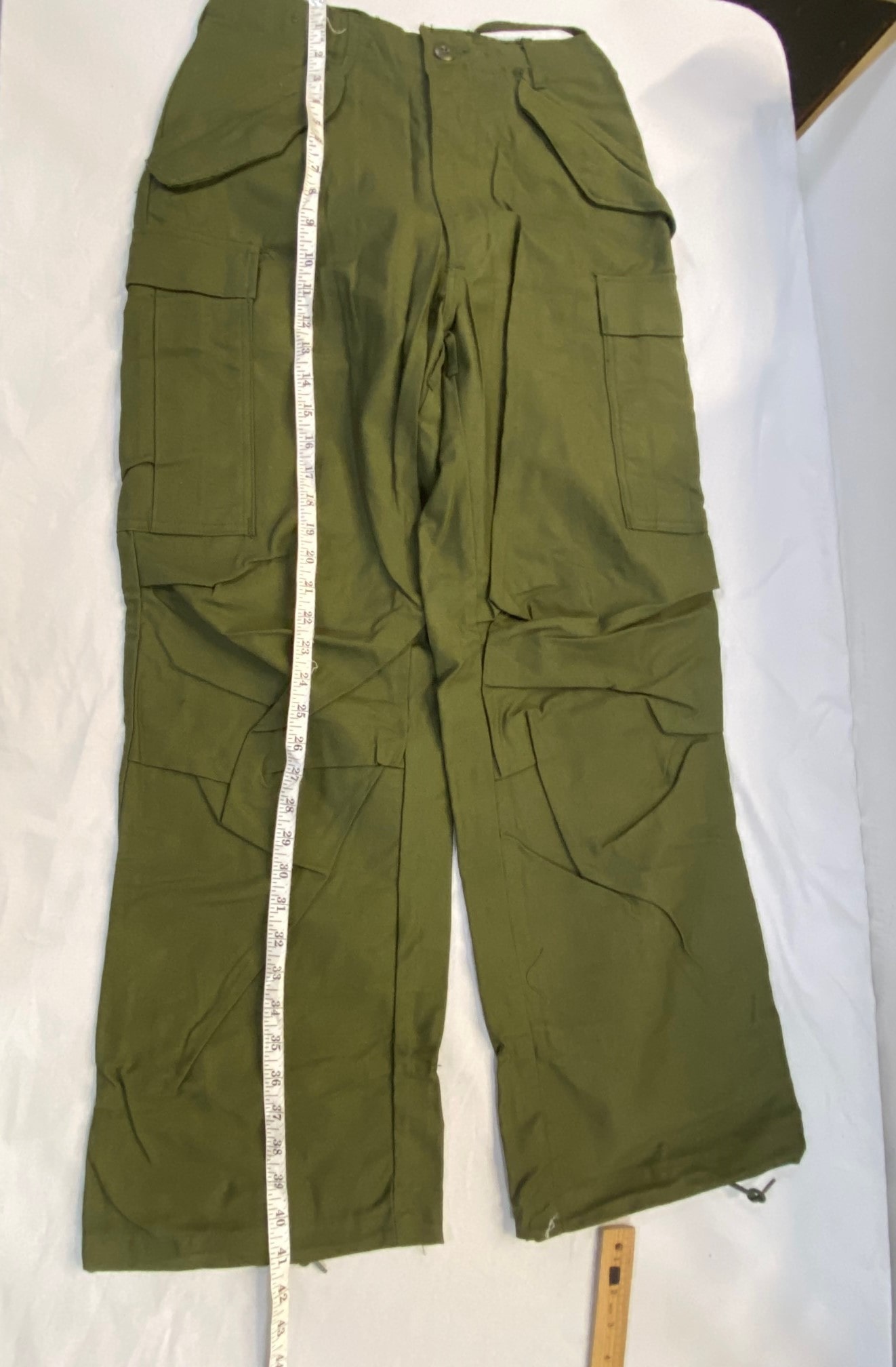 Original Military Issue. New old stock with some shelf wear. Water and wind resistant. Features the leg pocket tie straps to help you secure heavier loads. M-65 OD field pants.