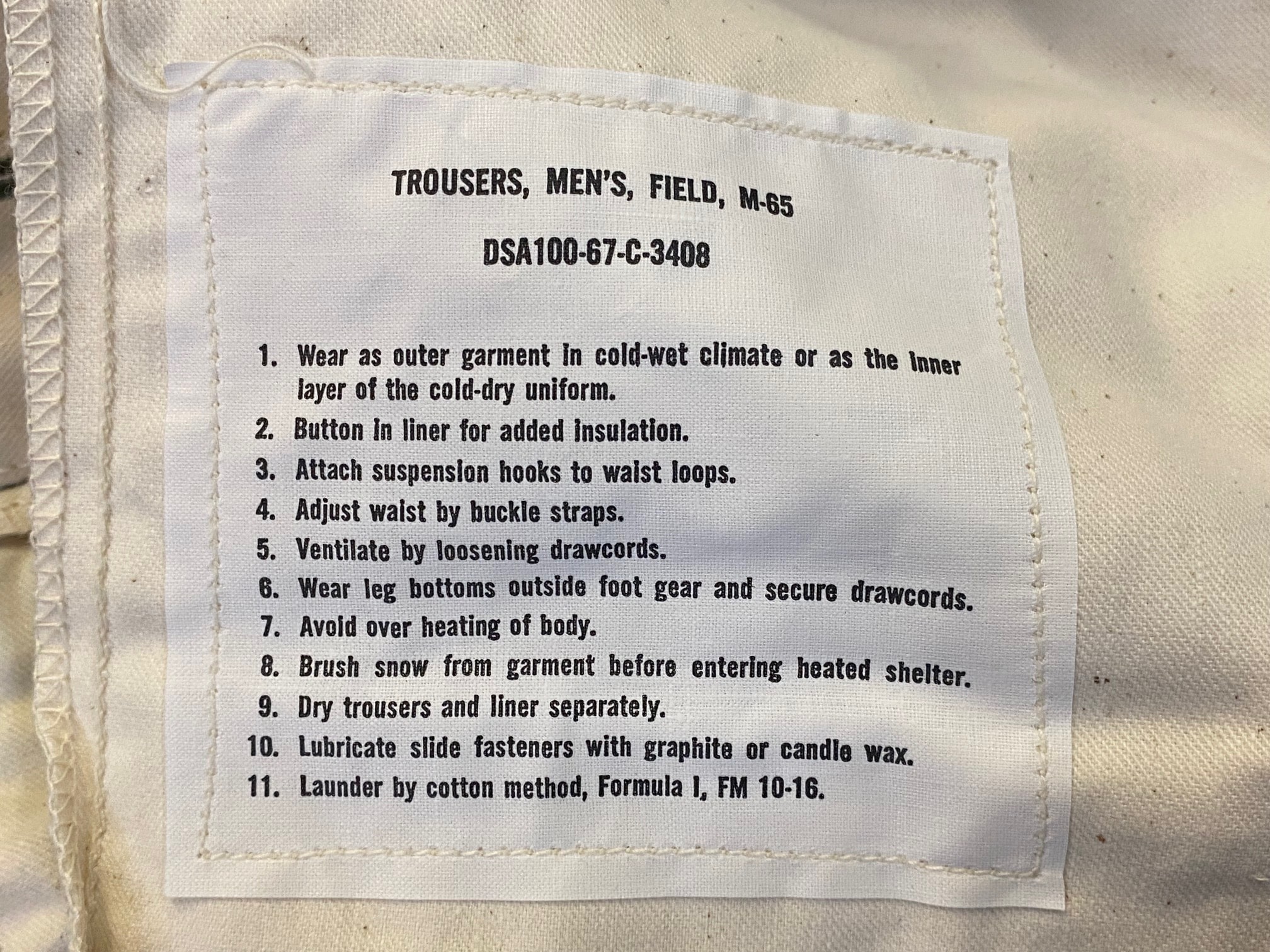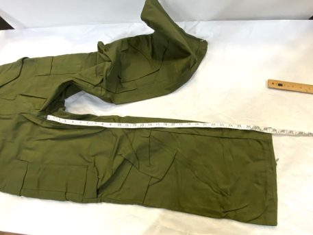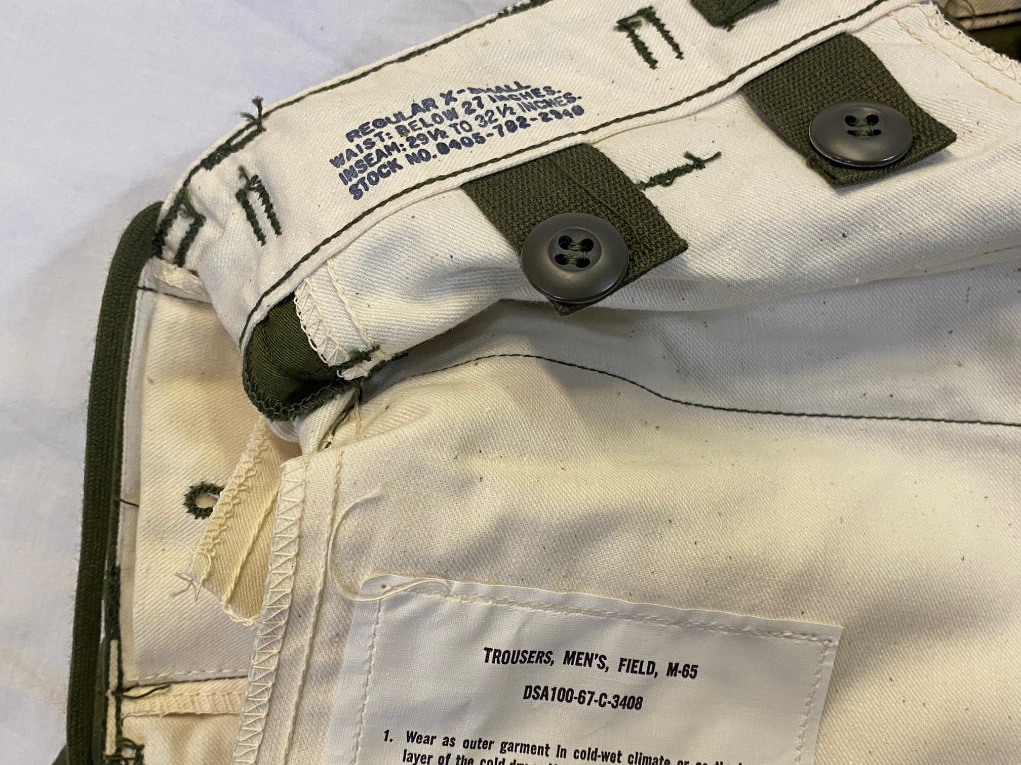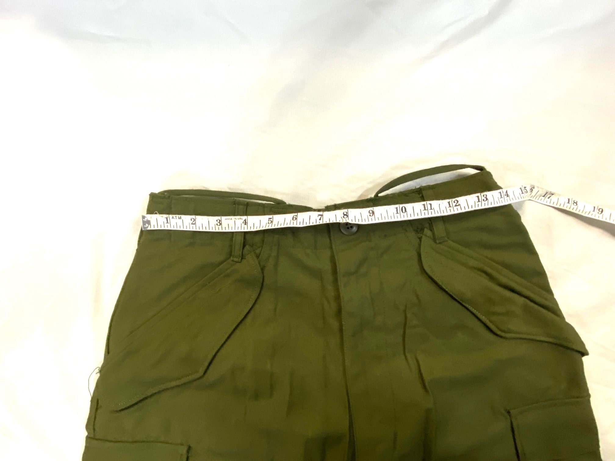 Original Military Issue. New old stock with some shelf wear. Water and wind resistant. Features the leg pocket tie straps to help you secure heavier loads. M-65 OD field pants.