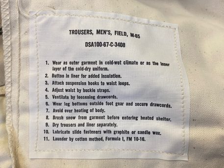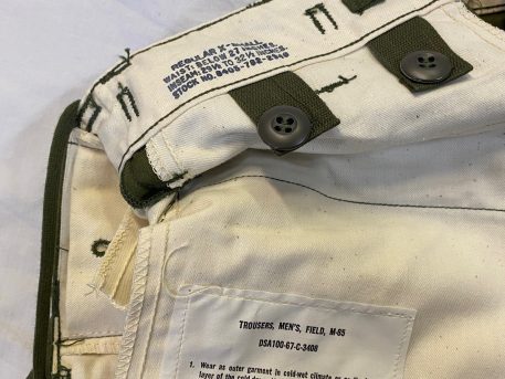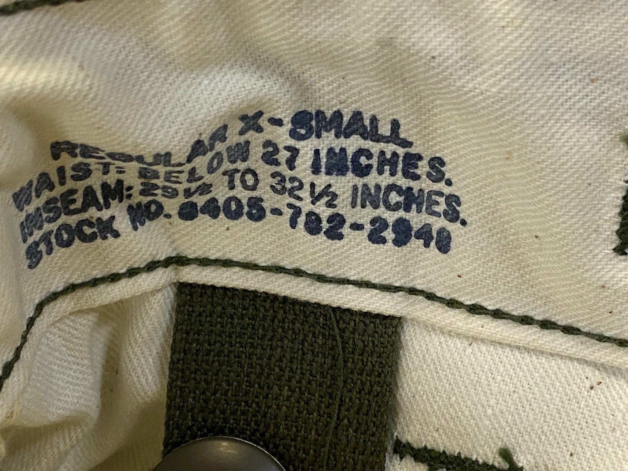 M-65 field trousers are similar to the m80 BDU’s except the m65 field trousers are cut larger to accommodate the optional button-in liner. Made from heavy cotton poly poplin. Size XSR, XSMALL REGULAR.