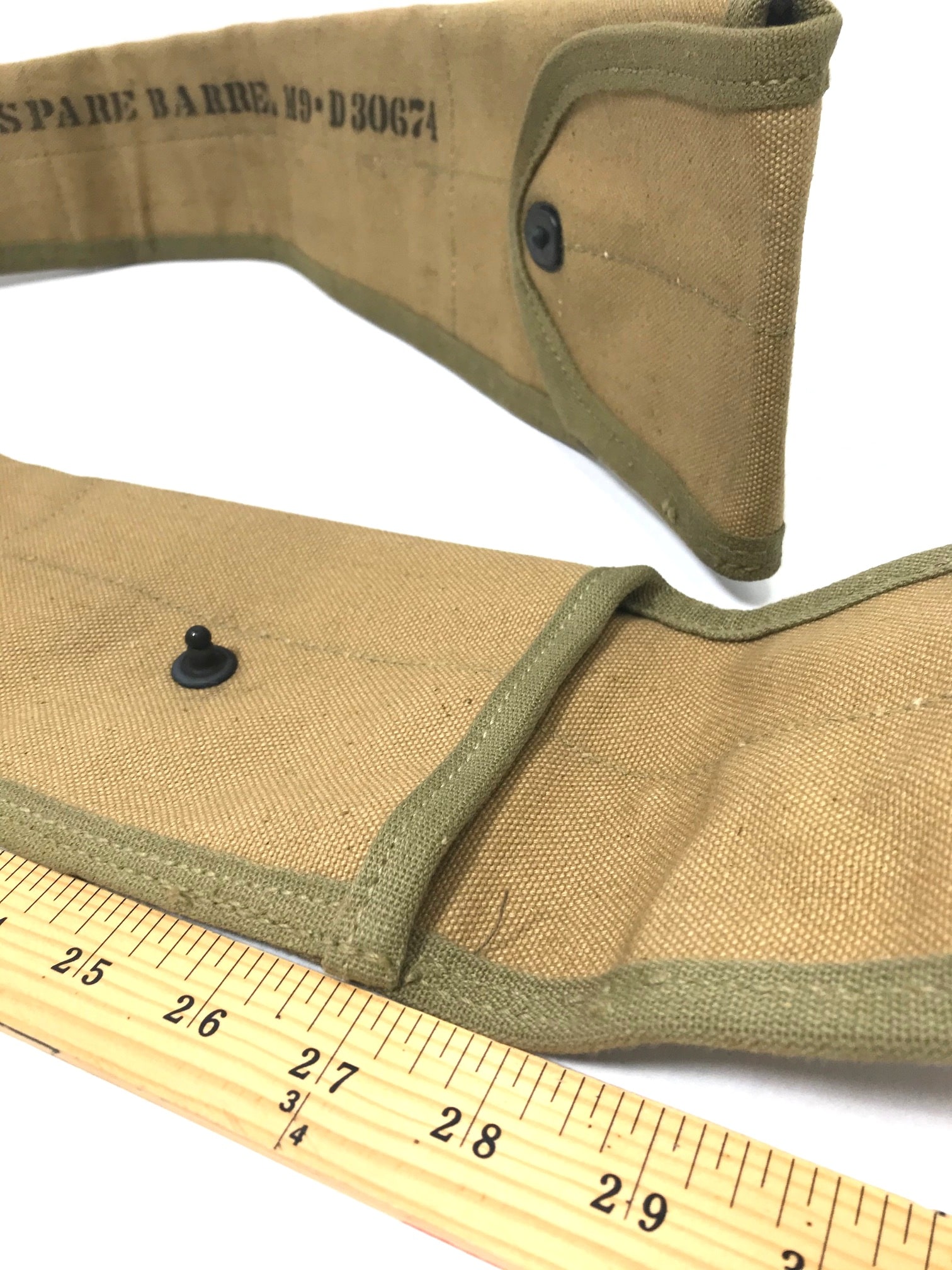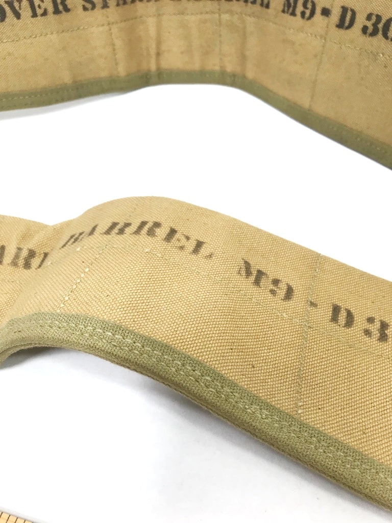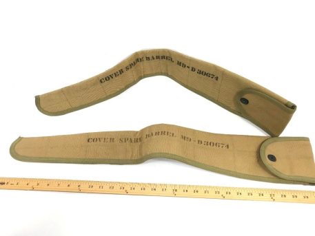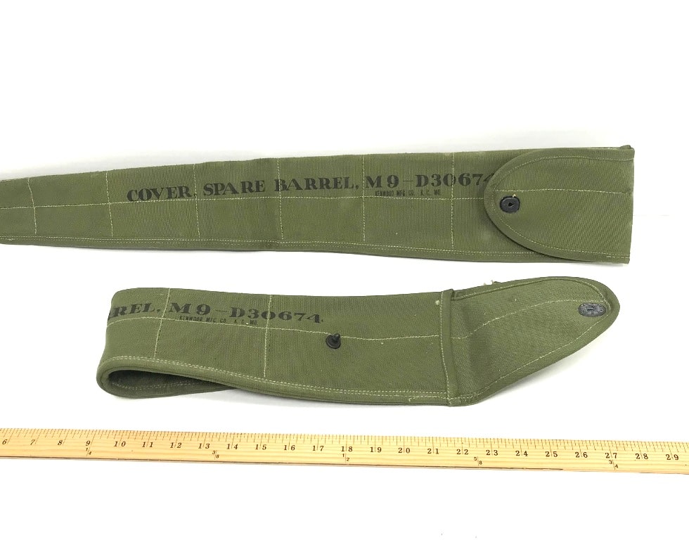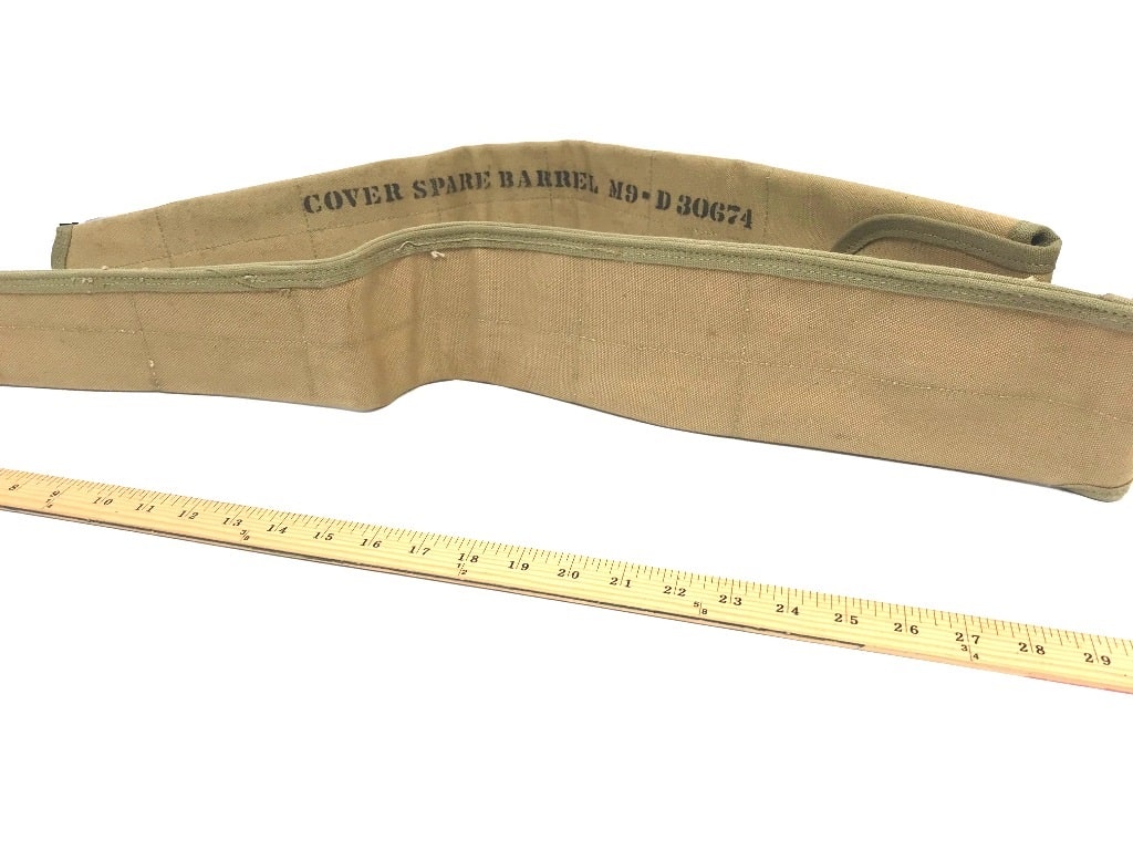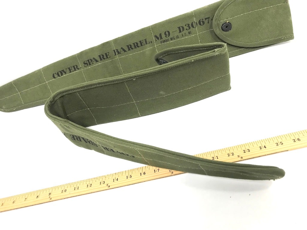 M-9 Barrel Cover. New old stock with some stains and discoloration. Snap closure and measures approx. 30″ snapped. WWII khaki and O.D. available.
