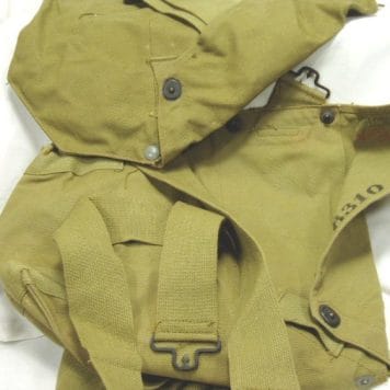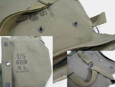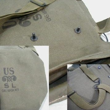 Military gas mask bag .Original issue for the M-9 gas mask, these bags are great for waterproof river bags. They measure 13″ x 18″ fully open. Made of heavy rubber and canvas. 2- strap design (one over shoulder and other around waist make for easy side-open access. The snaps were famous for breaking, but there are three of them and at least two should hold. Used good condition.