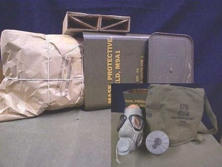 M-9 Korean war era gas mask. Sealed in original container with factory sealed filter. Also includes the carry bag. Mint condition with some very minor surface rust on the tin container. Size Medium.