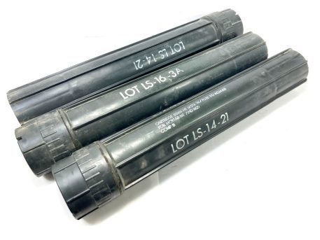 Originally for 81MM cartridge and fuse. 3″ x 22 1/2″. These are made of Plastic with screw on lid. These are used but in good condition
