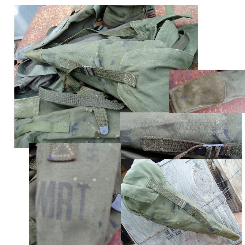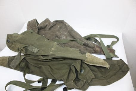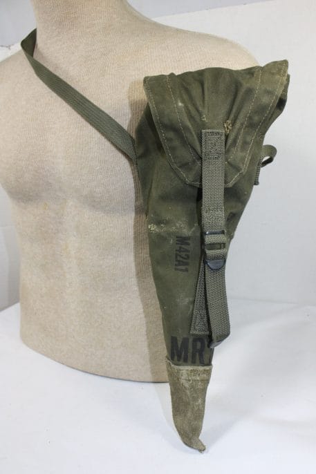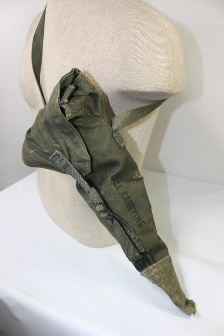 The carrying case is used for storing and transporting the M15 tripod that is designed to support an M49 Telescope. The case is constructed of duck cotton cloth and nylon webbing. The case was stenciled with the letters MRT , indicating it has been mildew-proofed. One end of the carrying case has a leather cap sewn on to protect the tripod. These have seen their fair share of abuse. Expect small holes, slight rips, and tears. Still serviceable.