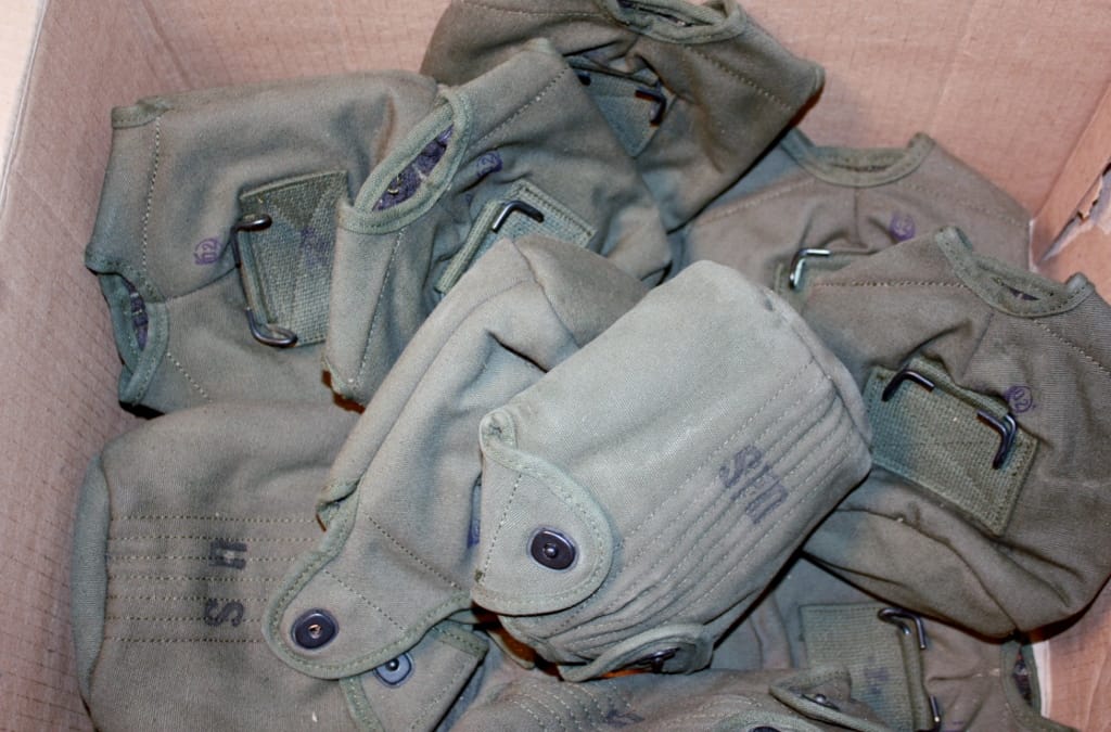 Vietnam issue canvas canteen covers for collectors and reenactors. These early issue vietnam canvas M56 canteen covers feature the old WW2 style wire hook fastener. New old stock with a fair amount of shelfwear. Only a few left in stock!