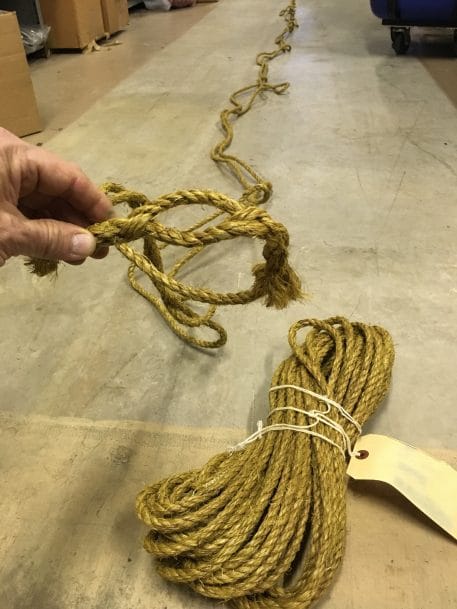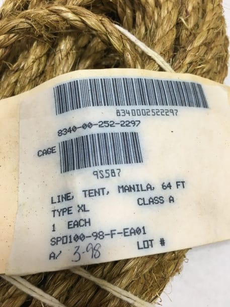 Tent rope. 3/8″ x 64 ft long. Twisted hemp rope for the tent guy lines. This rope has a smell to it-like kerosine. Some chemical agent on it for the rope to last longer not to deteriorate. Military tent rope used by the US military for extra large canvas squad tents. There is a loop woven in at 32 feet to go over the tent pole.