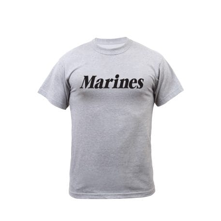Grey cotton PT T-shirt “Marines” in black print on front.