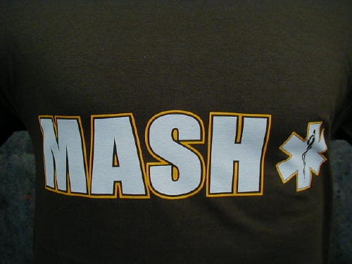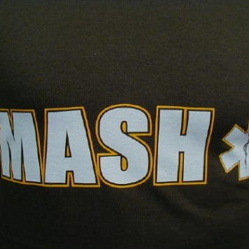 All cotton short sleeve O.D. green t-shirt with large “MASH” logo.