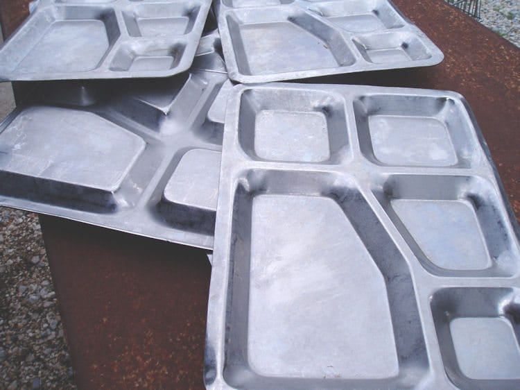 Military Mess hall trays. Heavy duty stainless steel holds up to lots of abuse and is easy to clean. 5 compartments. used with scratches bumps, dings, and bruises.