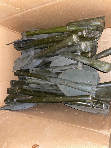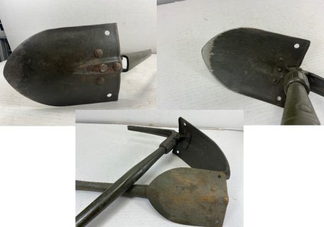 Wood handle Army shovels with pick: used condition with scratches, scuffs, and discoloration from shelf wear. This shovel is a great entrenching toll for digging your next foxhole as well as your rose garden or plumbing job. Compact and strong for durability and ease of use. The shovel and pick can be opened and operated in two positions independently of one another. This is a classic piece of military history that can be passed down for generations. combination tool