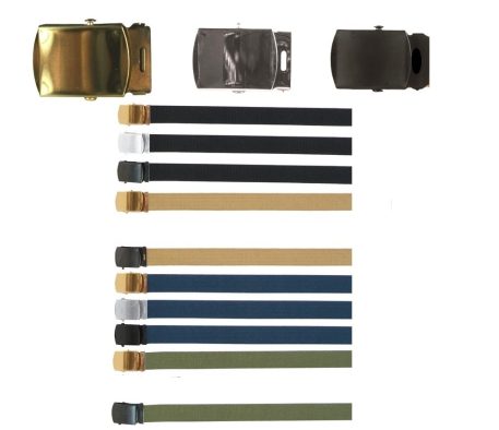 Military style web belts – colors and buckle styles. Check drop-down for options. Cotton 1 1/4″ wide webbing with a brass-plated tin buckles. Buckles are brass, silver nickel, or black closed-face unless specified otherwise. Fits up to a 50 size waist. Adjustable to smaller sizes by cutting from bottom of belt