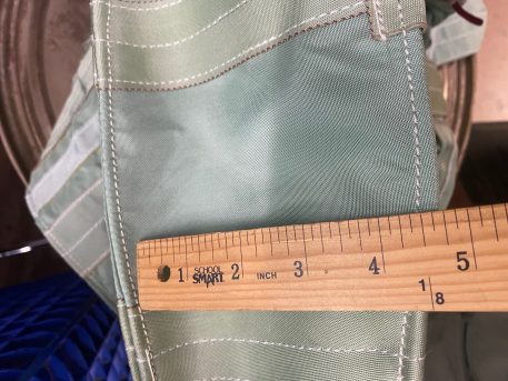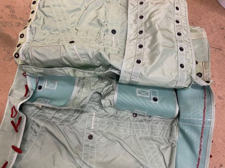New old stock aviation parachute deployment bags. Bottom open with tie downs and top handle. Mint green in color. Approximately 18x10x6.