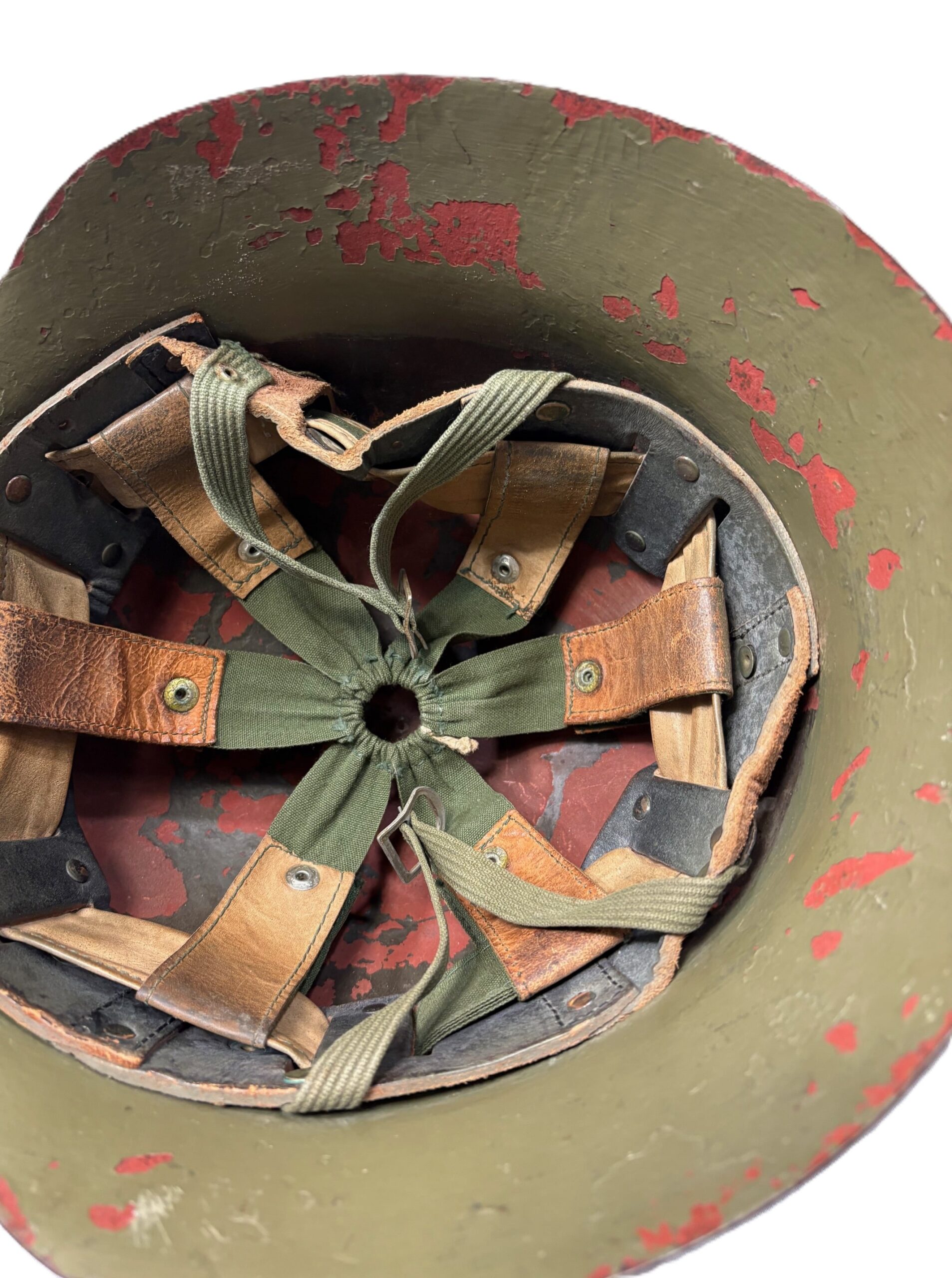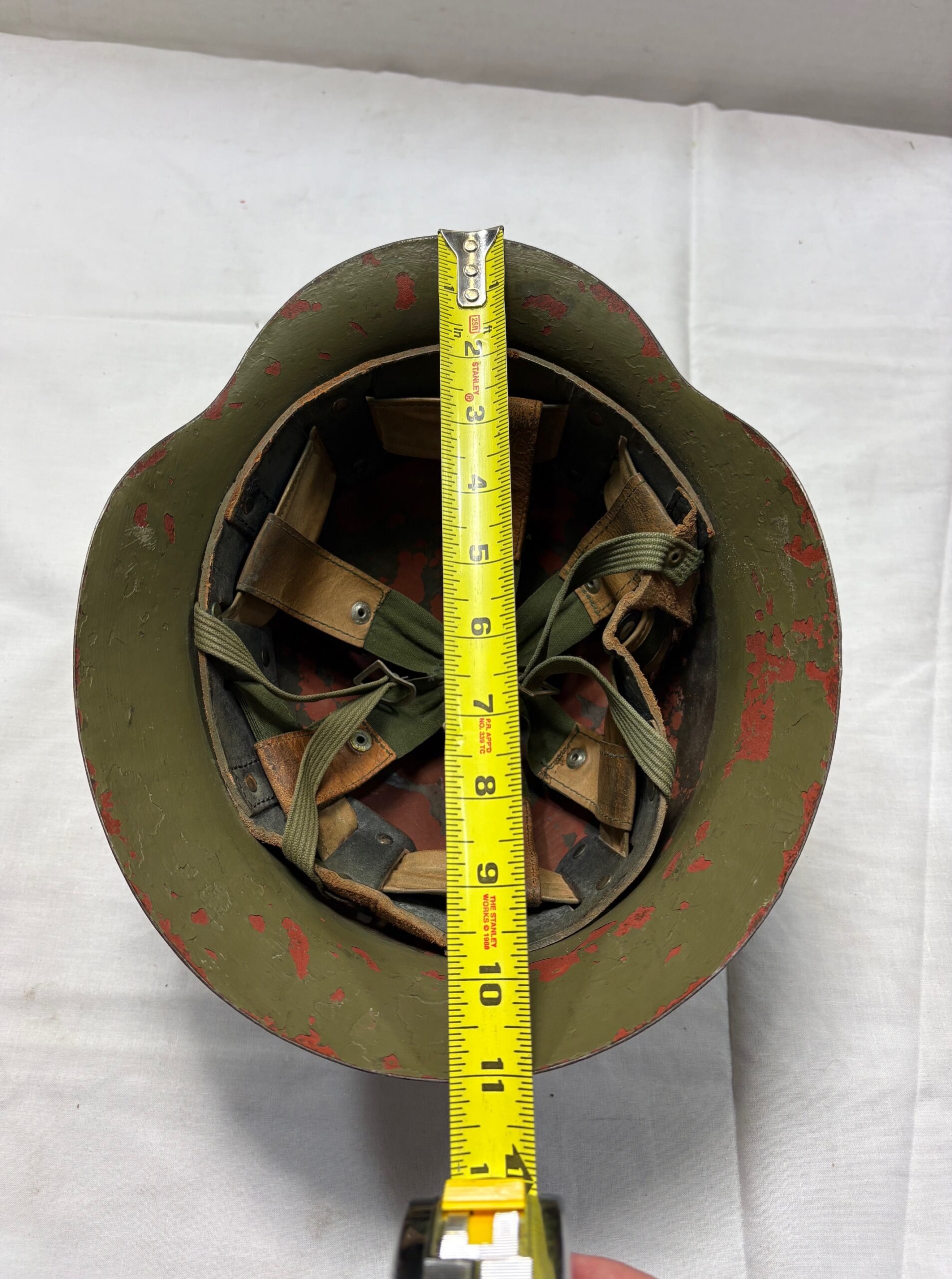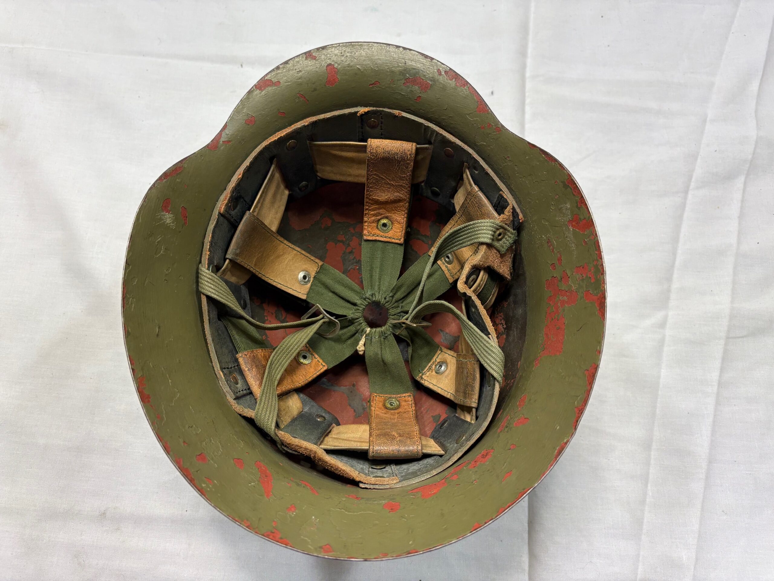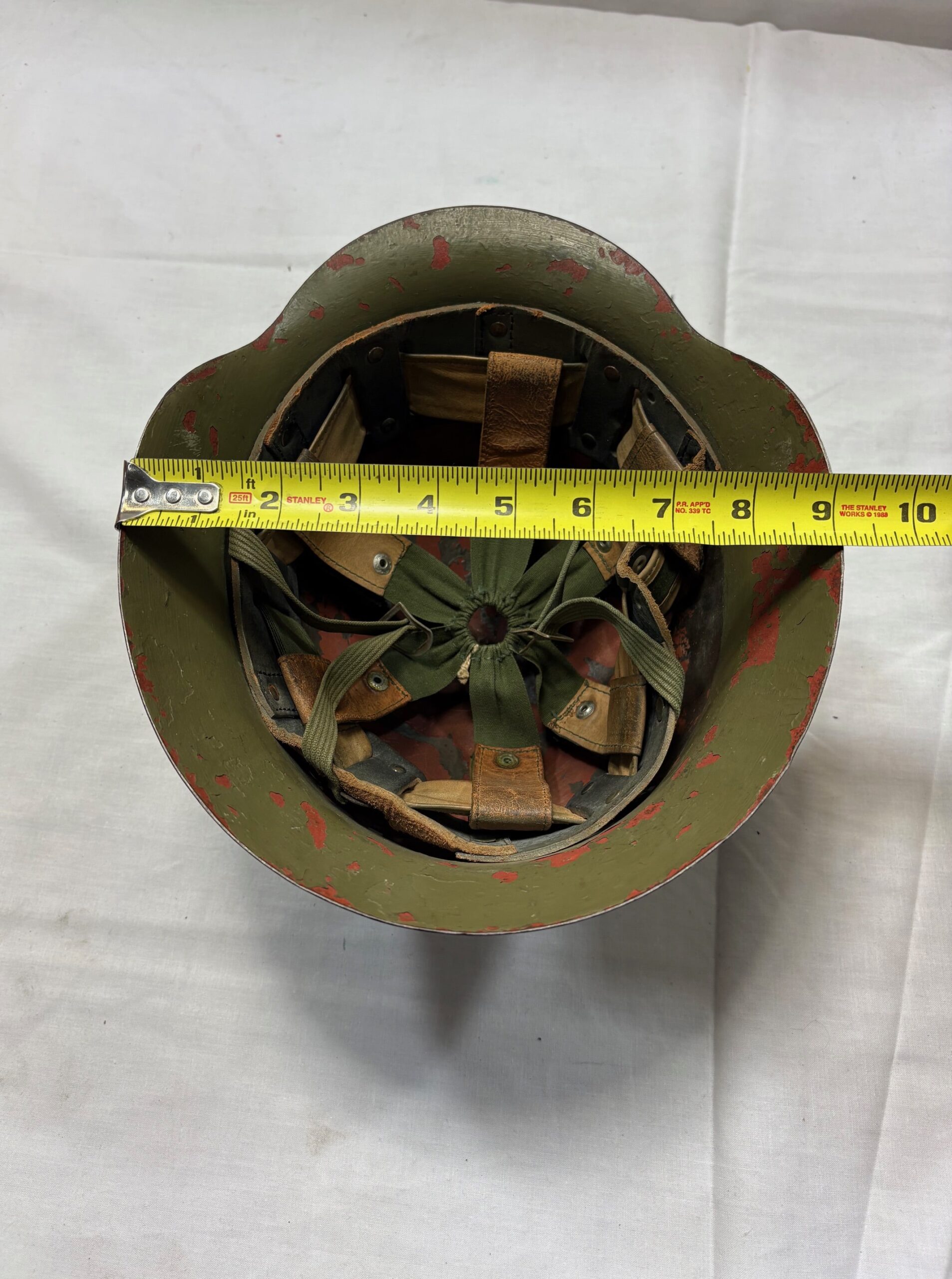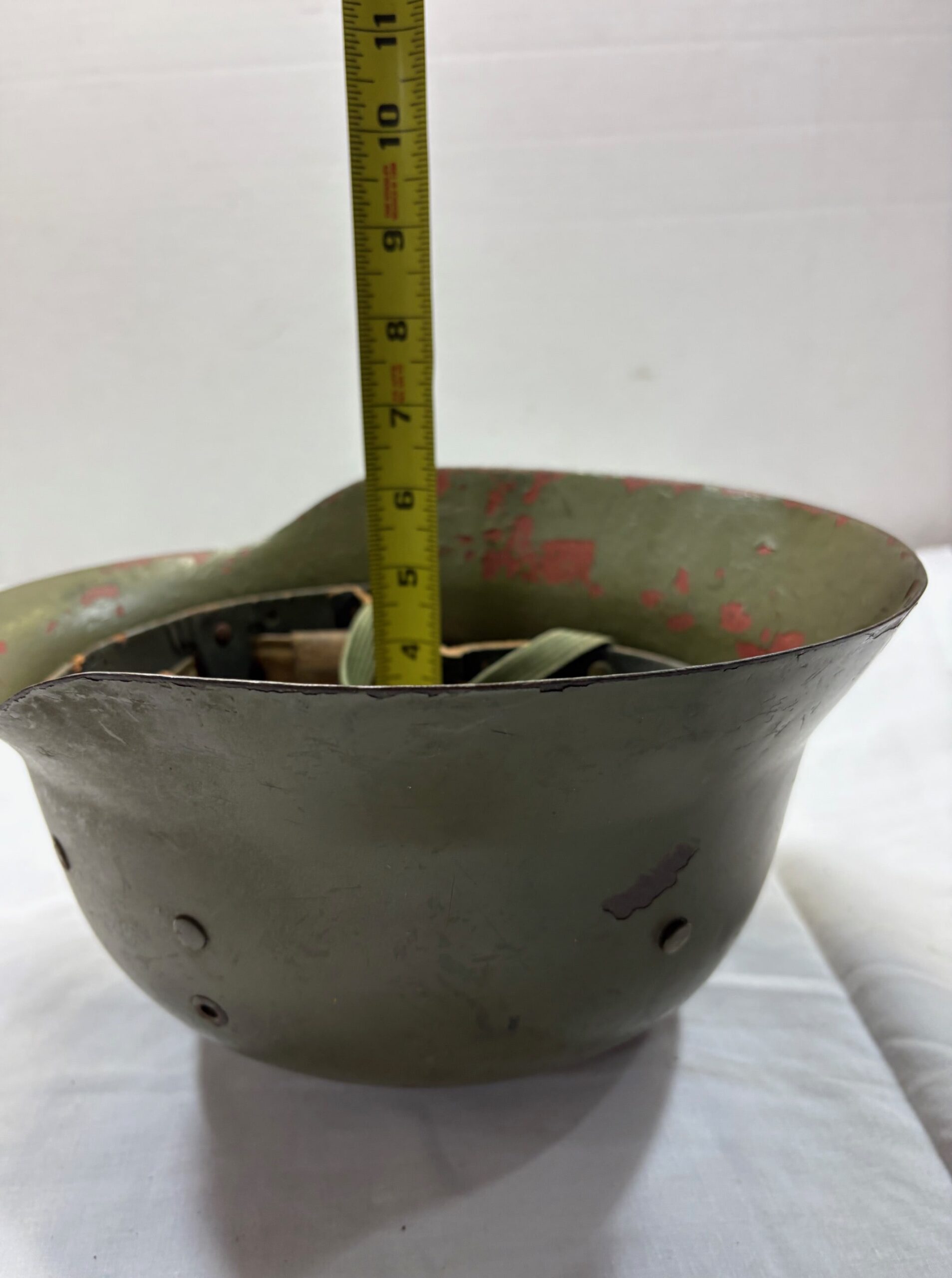 Spanish military issue helmet, used good condition. Scratches and some chipped paint on the metal helmet, but inside very clean leather/cotton suspension. Partially Intact *missing a connecting grommet to the helmet to attach suspension* not rotted for its age!