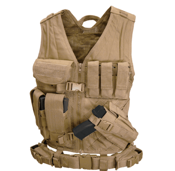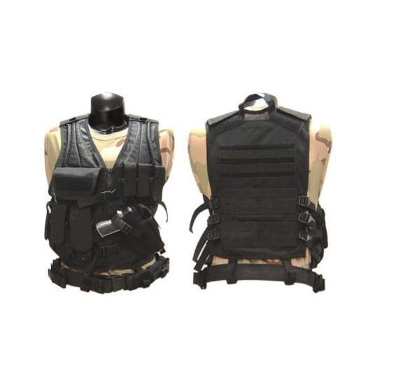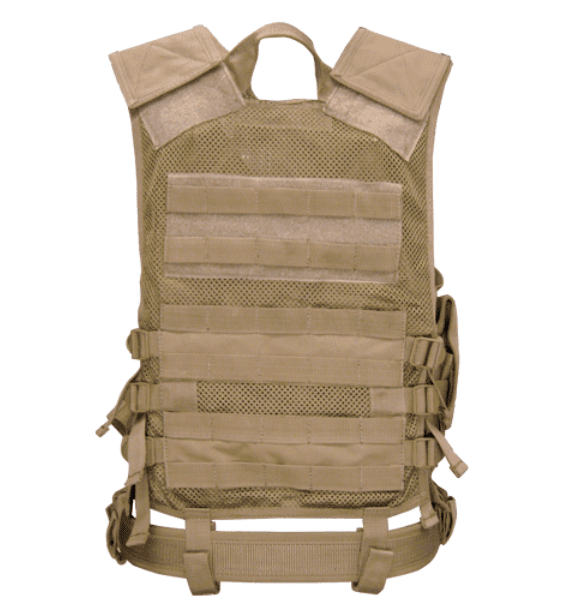 Right side has 3 large ammo pouches(30rd capacity), above the ammo pouches, the right side has a large shell carrying pouch and a shooting pad. Left side features a pistol holster capable of carrying most medium-framed pistols, 3 pistol magazine pouches which are fully adjustable to the height of most normal-sized magazines and a radio or FFD pouch. Vest is mounted on tough nylon mesh material which aids ventilation. Shoulders on vest can be adjusted with long hook and loop strips, and also have 2 metal D-rings for the attachment of carabiners or other hardware. Vest zips up in front and can be secured additionally with a pistol belt (included) threaded through the loops on the bottom. Interior of vest has two zip-up document pockets left and right. Rear of vest is double-ply mesh which allows for the addition of a hydration bladder. A carrying handle is provided as well as strips across the back for the addition of camouflage material or other pouches. Left and right sides can be adjusted for width via drawstrings.