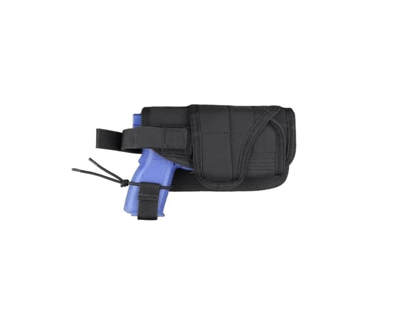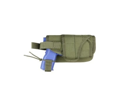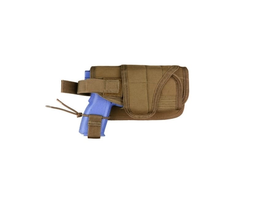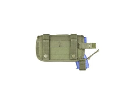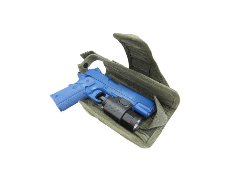 Horizontal mount on MOLLE platforms. Wrap-around design to fit pistols with laser or flashlight mount. Hook and loop strap to secure weapon. 4.25″ W x 8″ H x 1.5″ D