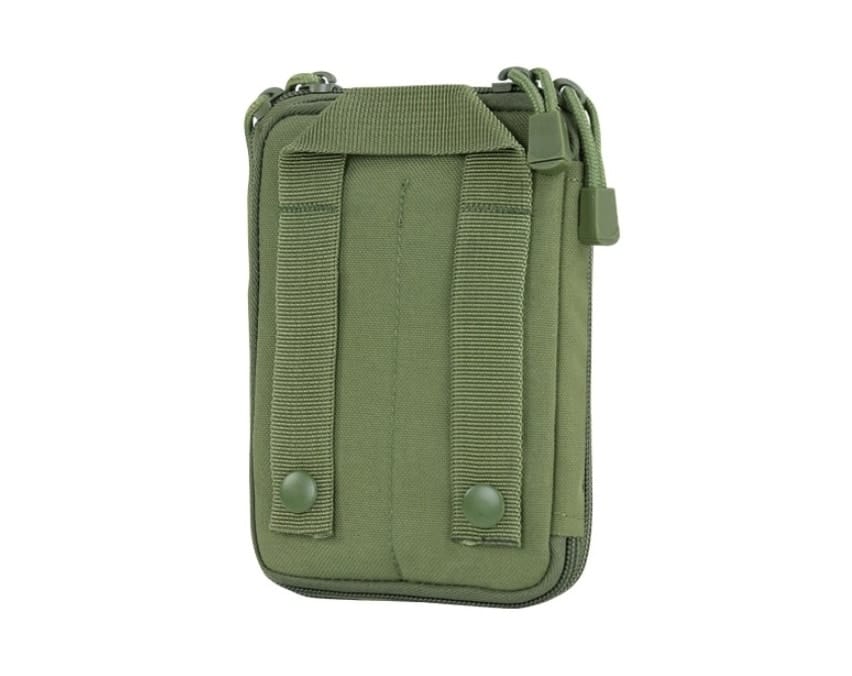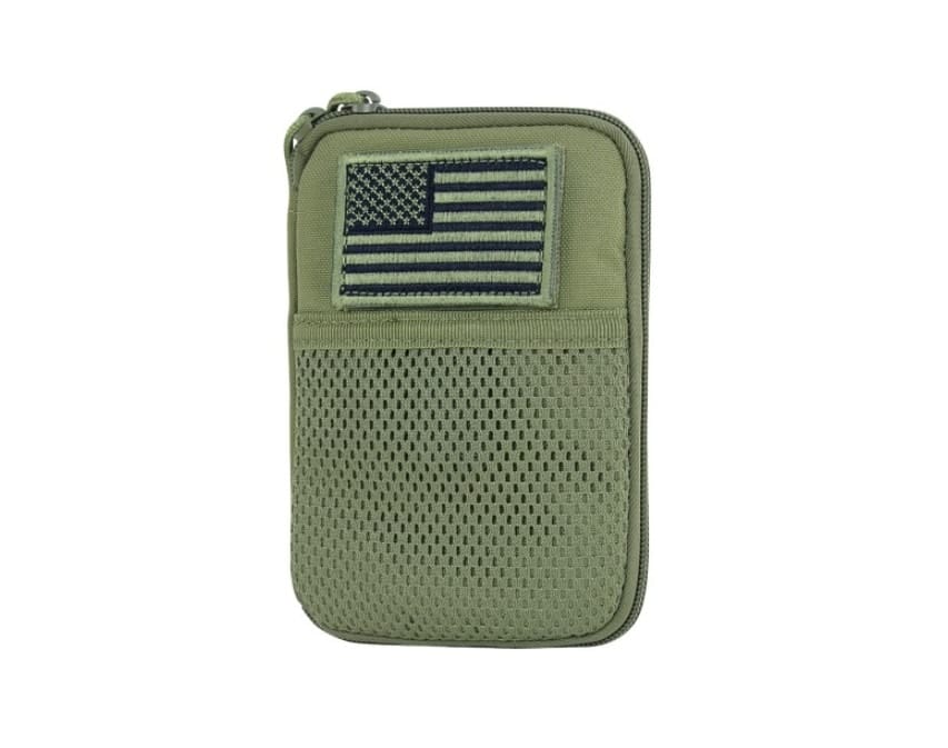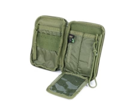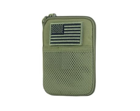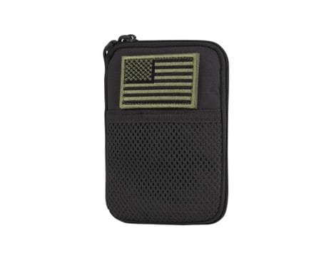 Three internal pockets; removable flag. A fold-out Vinyl sleeve w/padded back. Also has MOLLE straps on back that can be multi-positioned on vests, backpacks and belts.