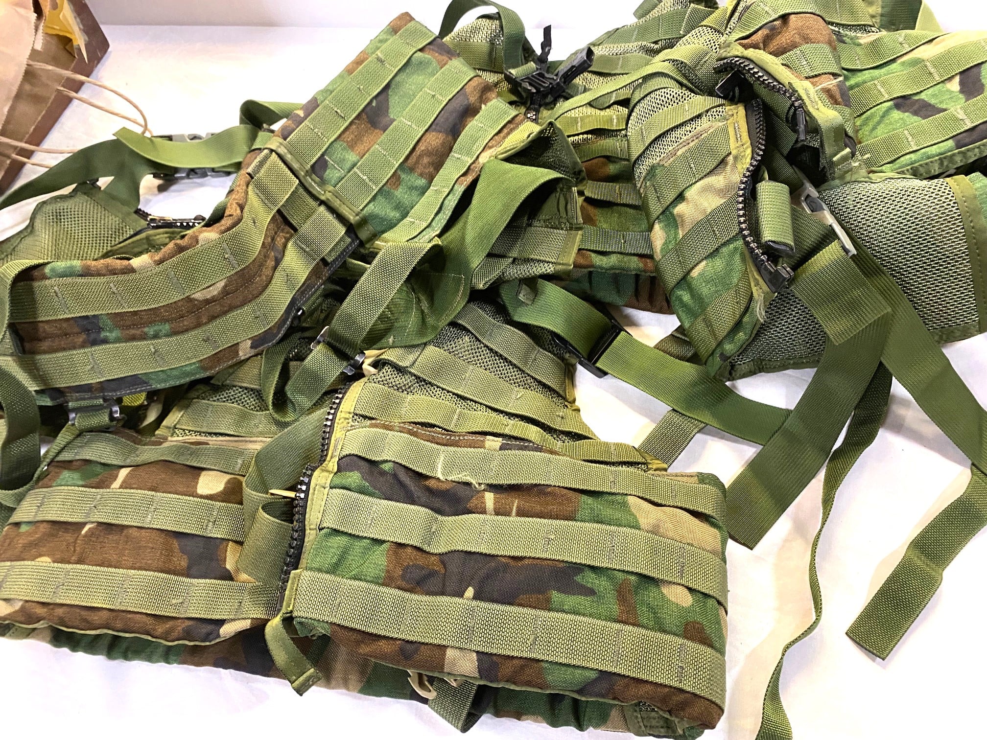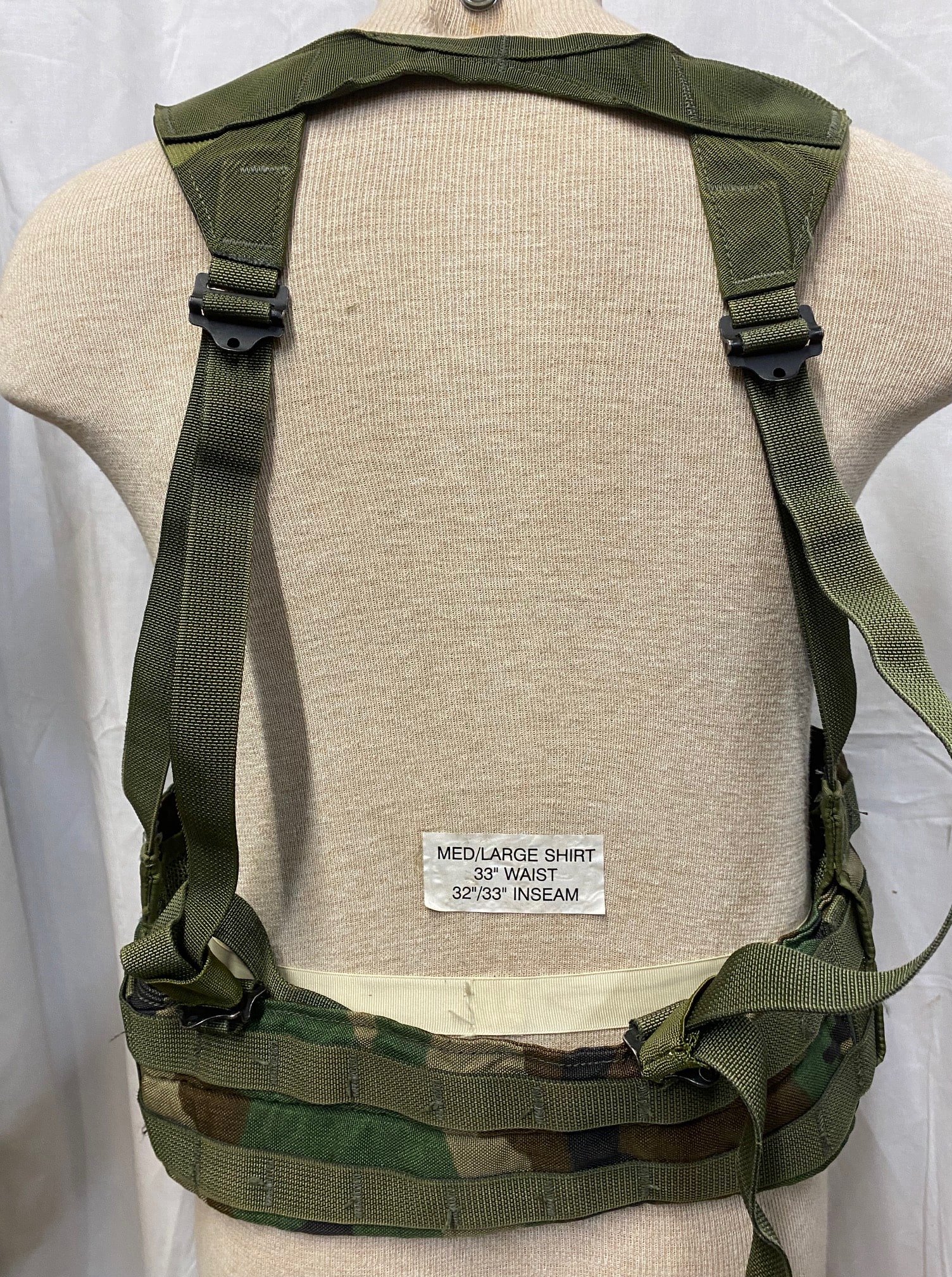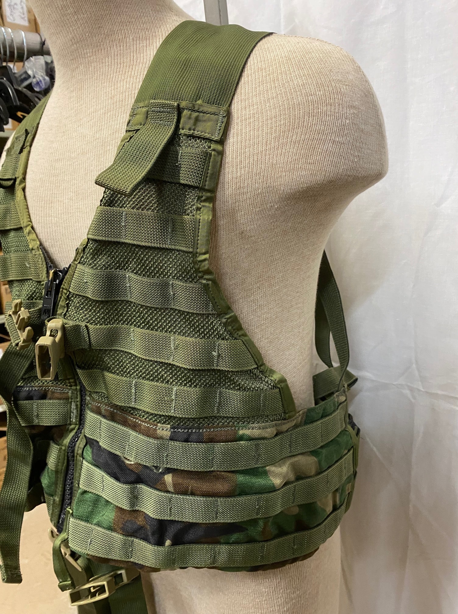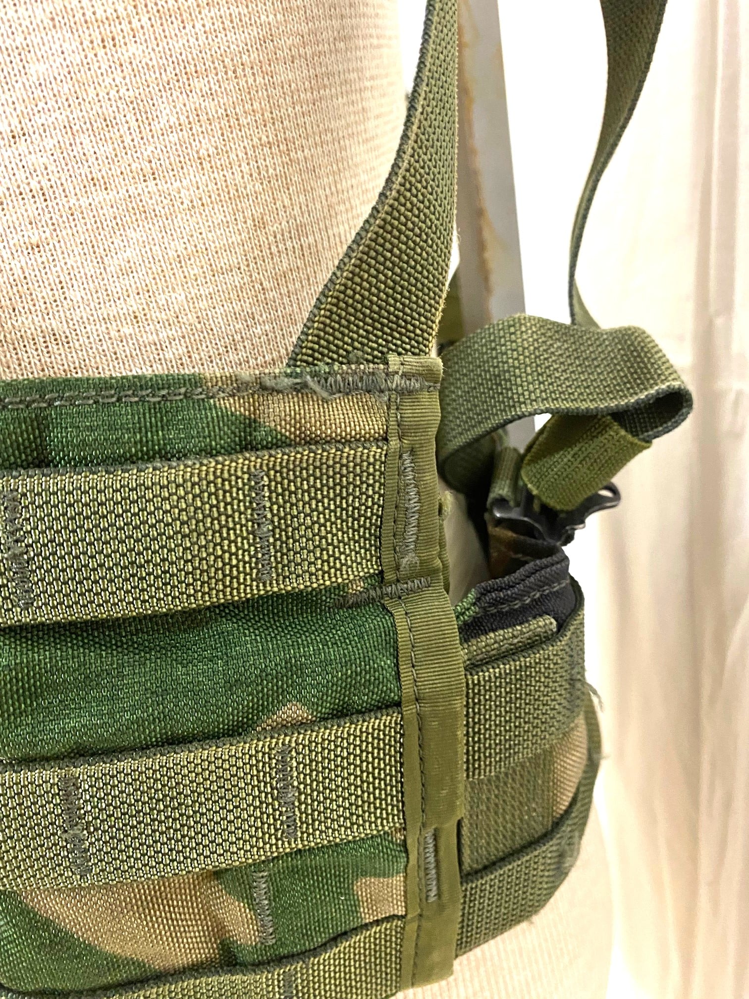 Molle M80 style woodland “flex” vest, chest rig assembly. Used good condition, some small fraying in areas and discoloration.