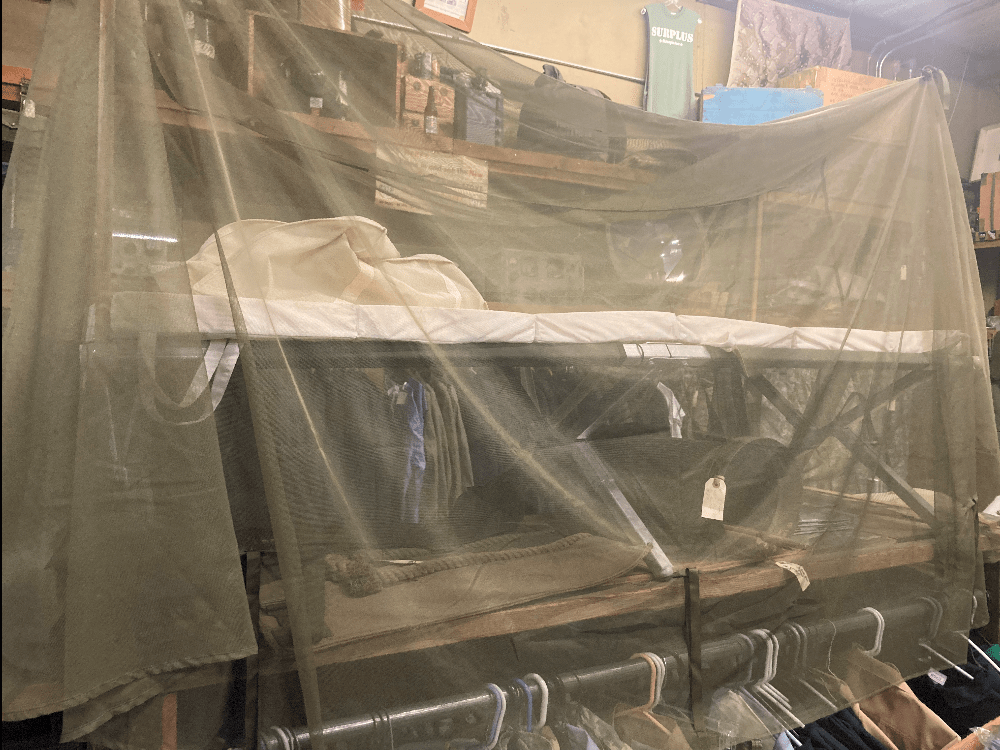 Genuine military issue mosquito bar, oversized to fit over a bed or inside of a tent. Can even be used to make a summer tent. We also have the frames that fit into the G.I. cot ends to support net above your cot. Lots of material, Approx. 10′ x 10′ when laid-out flat. New