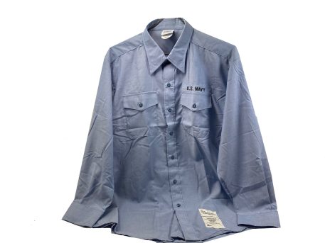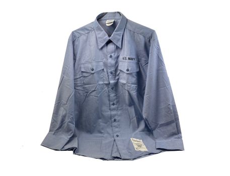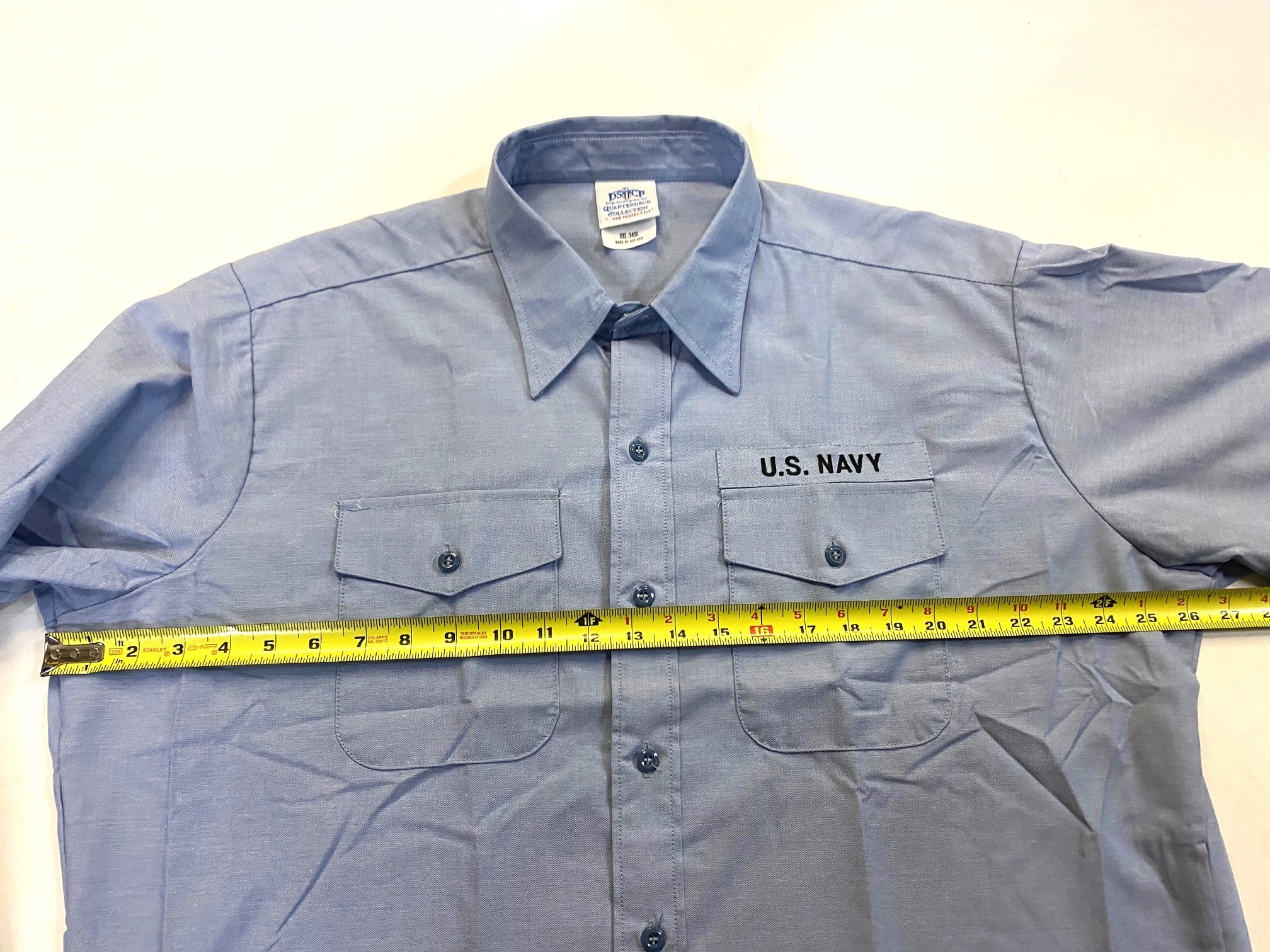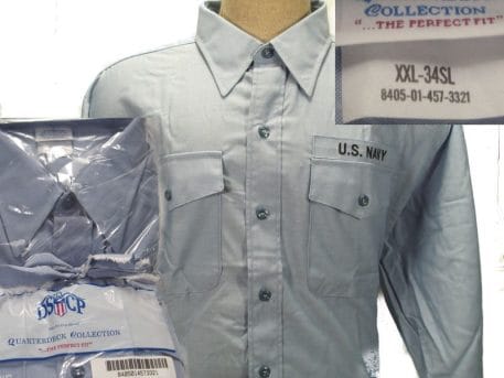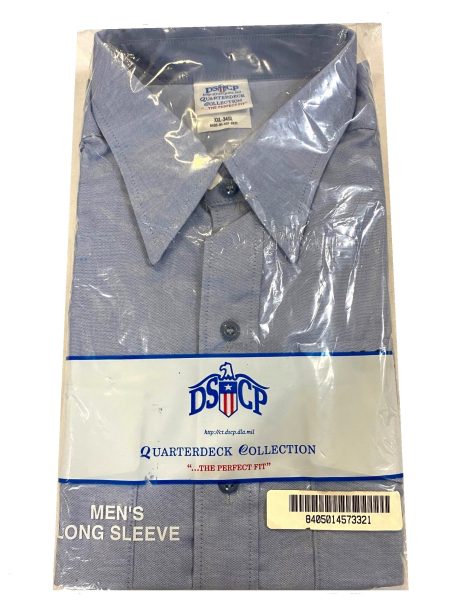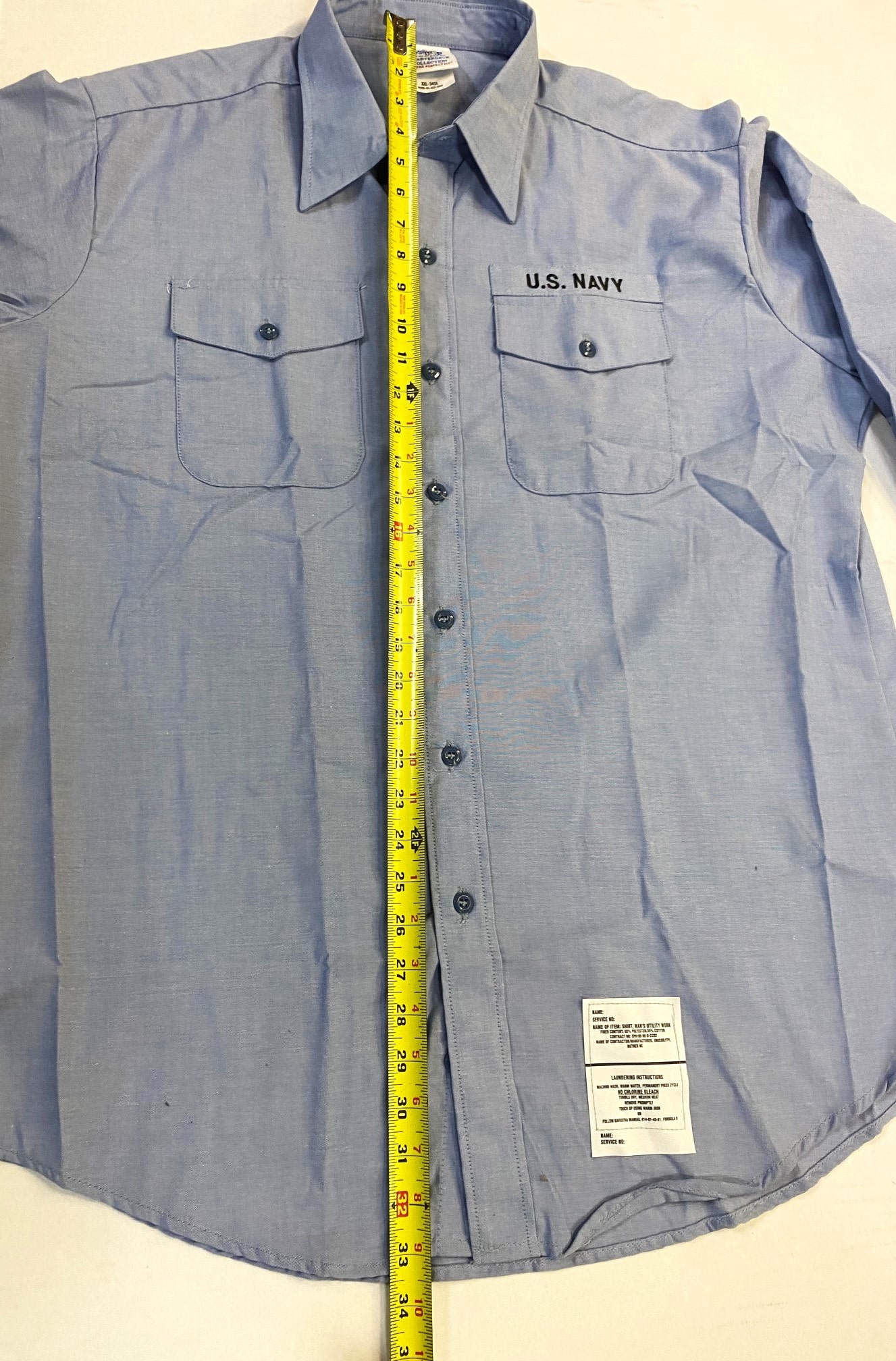 Navy chambray blue work shirt. Enlisted men wear these with the bell bottom trousers for everyday work-wear. Superior quality and extra big size too. XXL fits 46-50″ chest sizes and 32-34 inch sleeve length. New in original military government packaging.