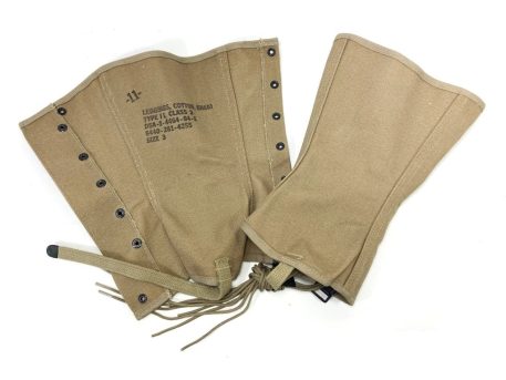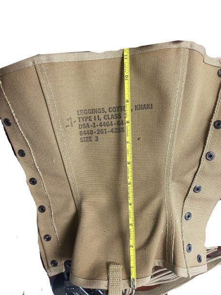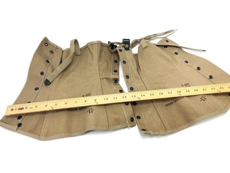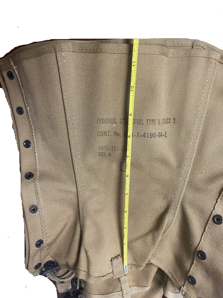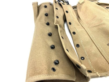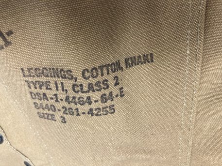 Navy Leggings Type 2 Class 2. Manufactured in 1964. Heavy cotton khaki canvas leg spats with all brass, black-coated hardware. All new original issue in mint condition with original laces.