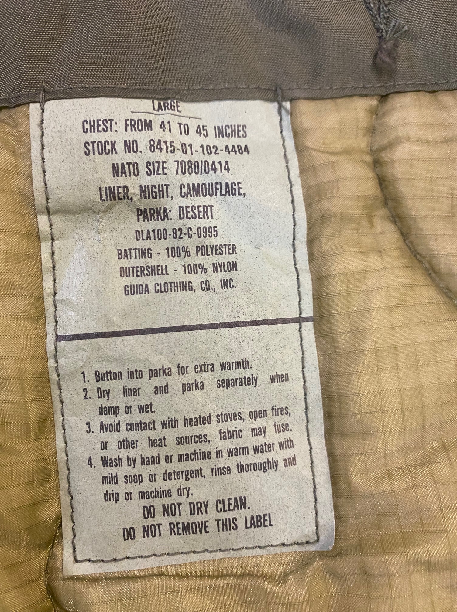 Night Desert or “Desert Night” camouflage during the Gulf War. This liner was designed for the parka. Slighty used condition, very good for age.