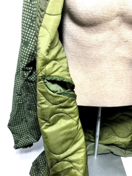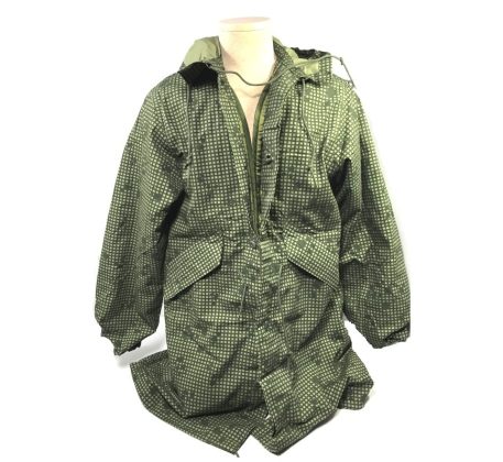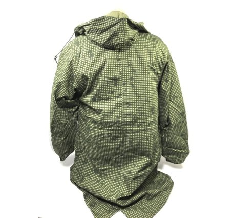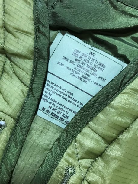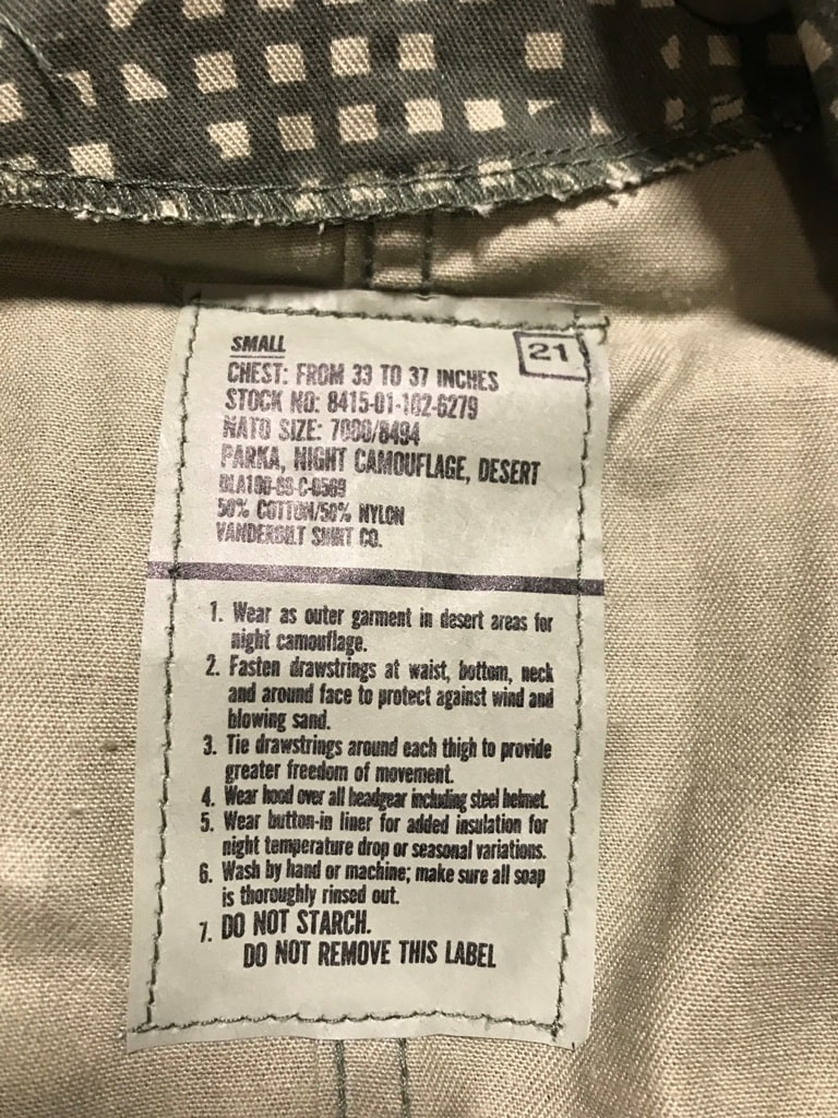 Put to the test during Desert storm, and Iraq. Original issue. New out of original case, dated. Includes nylon button-in liner, and hood. This Night desert camouflage parka has kept many a G.I. warm on those cold desert nights. Infrared scattering technology enhanced camo pattern, make these hard to pick up with night vision equipment. Size Small only