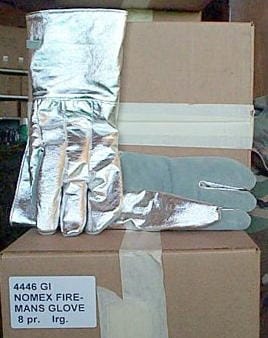 Aluminized Proximity Gloves. New Original Surplus. The “Ultimate Pot/Pan Holders”. Great for use in Metal Foundries, outdoor cooking, or any place your hands might come in proximity to high heat. These are in no way guaranteed to be fireproof. Please use sound judgement in their use. All size Large