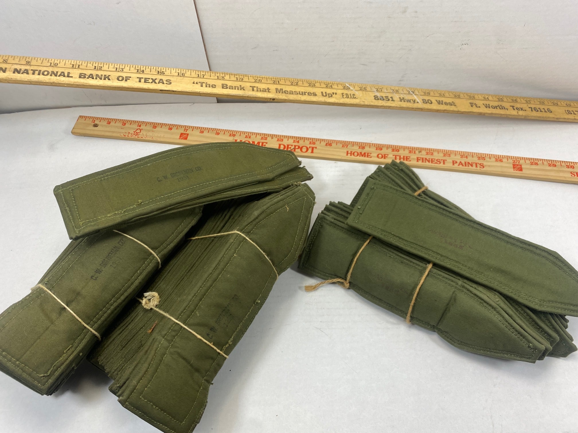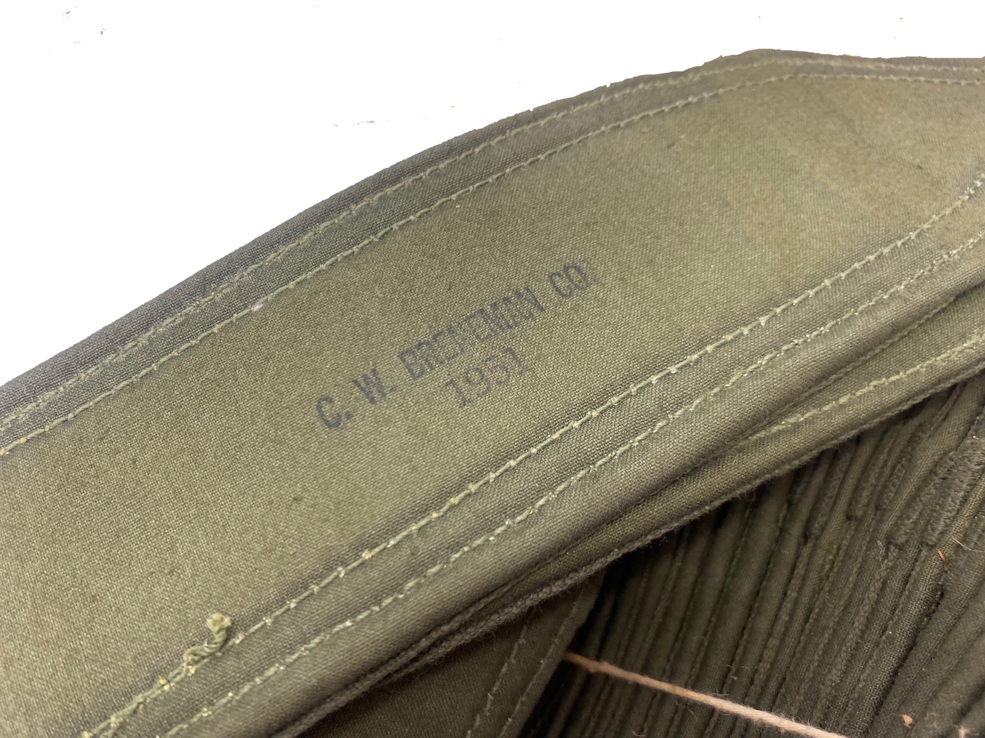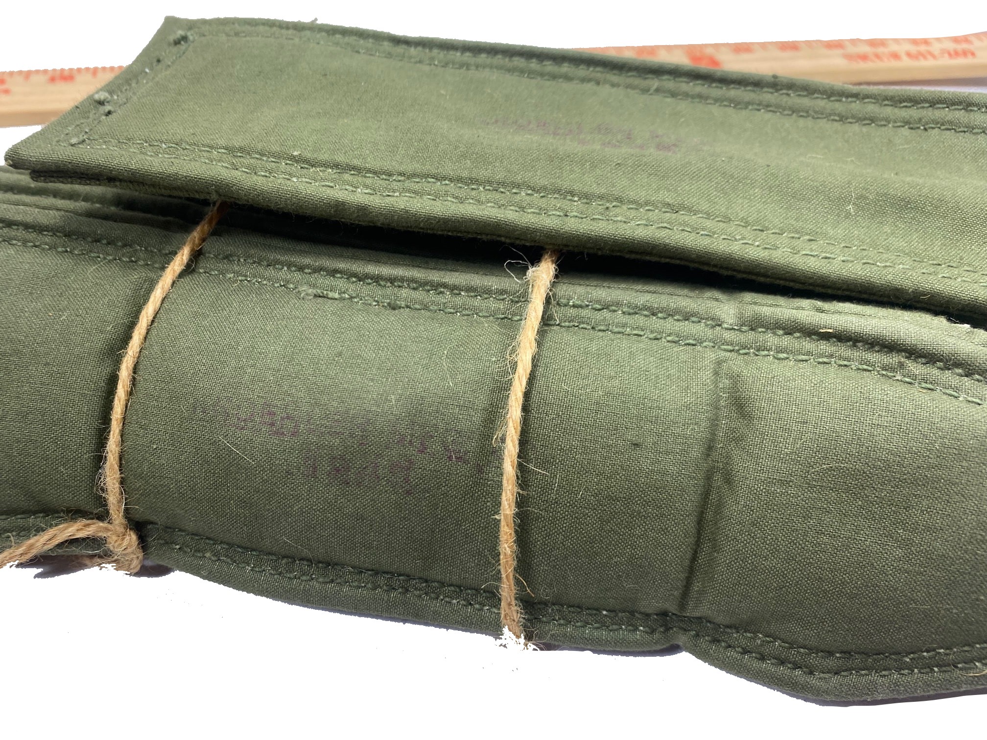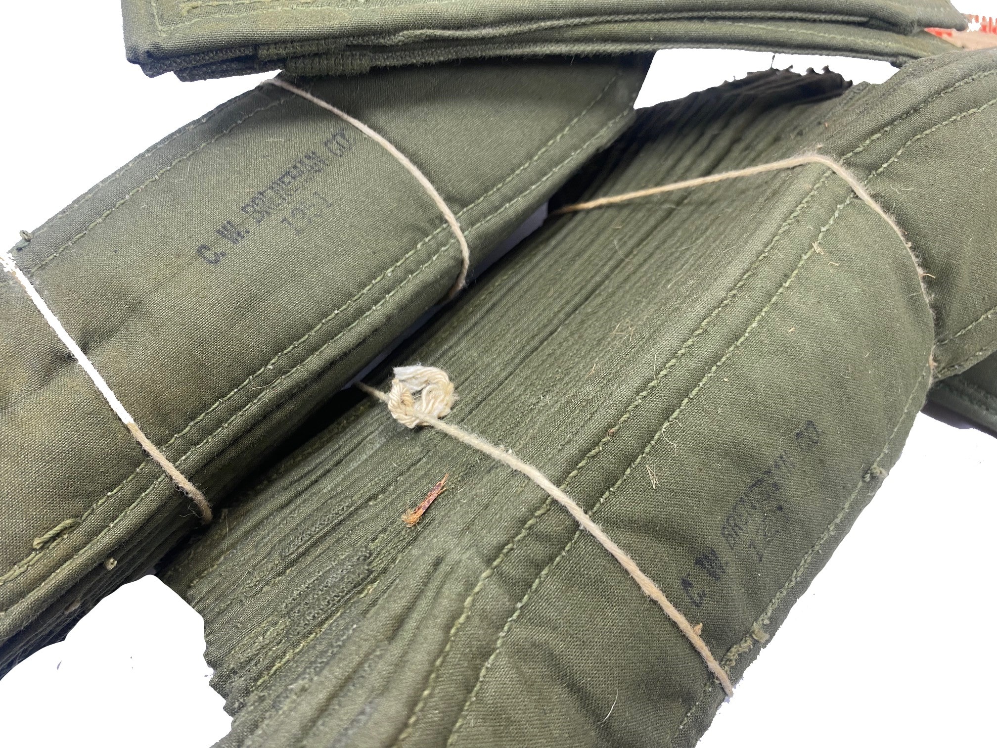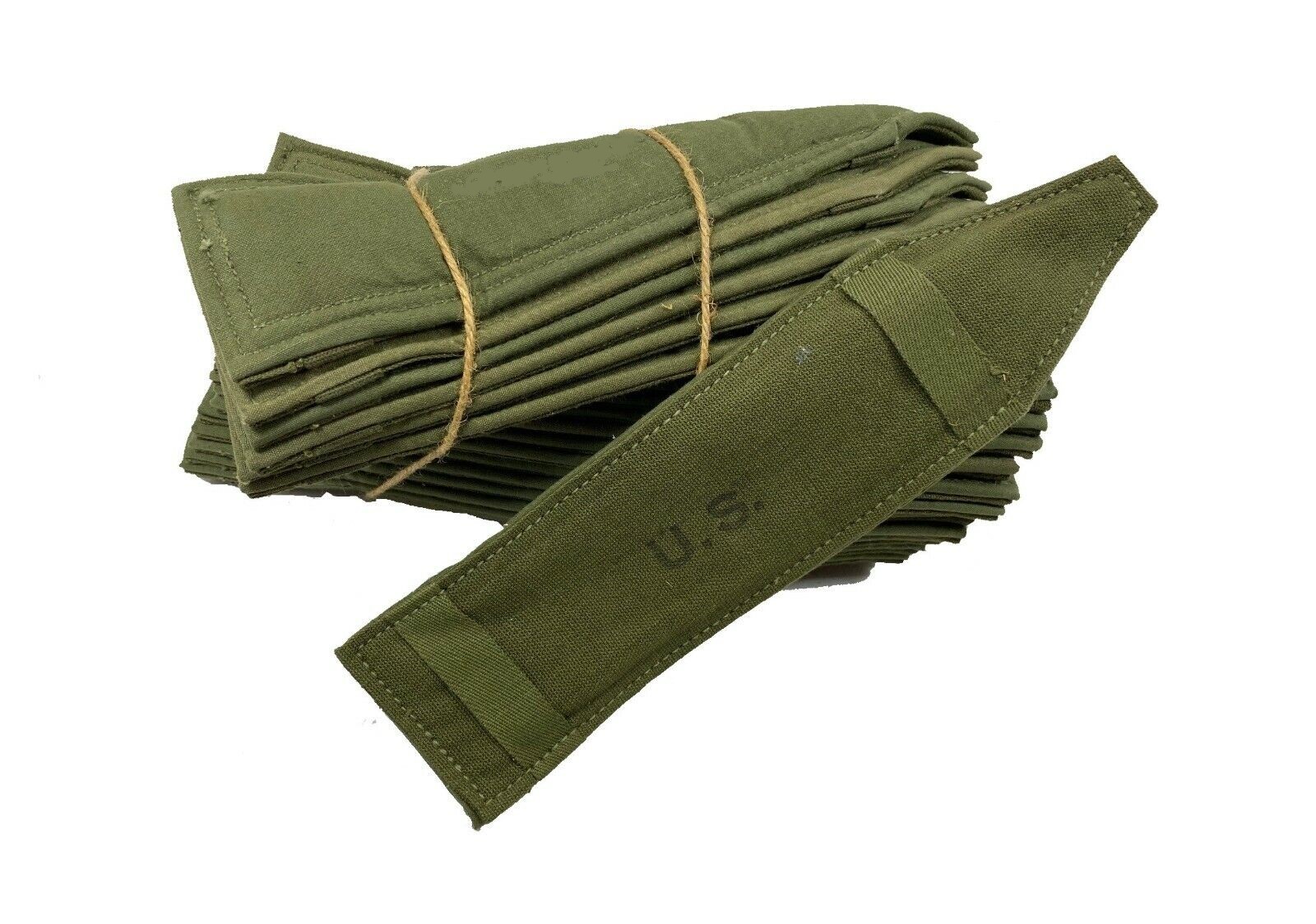 Olive drab canvas strap pads. Approx 3” x12”. These are sold by pairs. Left pad, right pad. Dates and Manufactures stamps are faded. SELLING AS NON DATED. YOU MAY RECEIVE ONE WITH A FADED WW2 DATE OR POST 1951 DATE.