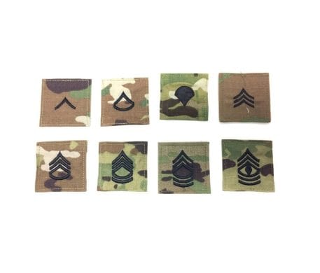 You can buy the latest in new issue army rank insignia, OCP- enlisted grade. 1″ x 1″ with hook and loop backing. $3.65 each.