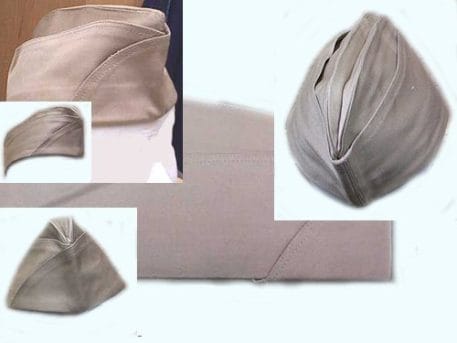 Overseas Garrison cap. This tan cotton folding garrison cover is still in use by the Navy. As new, some shelf wear. Perfect for re-enactors and stage-productions. Styles and shades vary depending on size. Some are the square top and others are the round. Also called the soda jerk cap, perfect for Andrew Sisters costume. We have sold many for use in theater productions like Biloxi Blues, South pacific, etc.