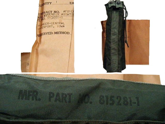 Manufactured by the Bendix Aviation Corp. Small sage green nylon oxy bottle pouch. Packed in 1956. New original surplus. About 12″ long and 1 1/2″ in diameter.