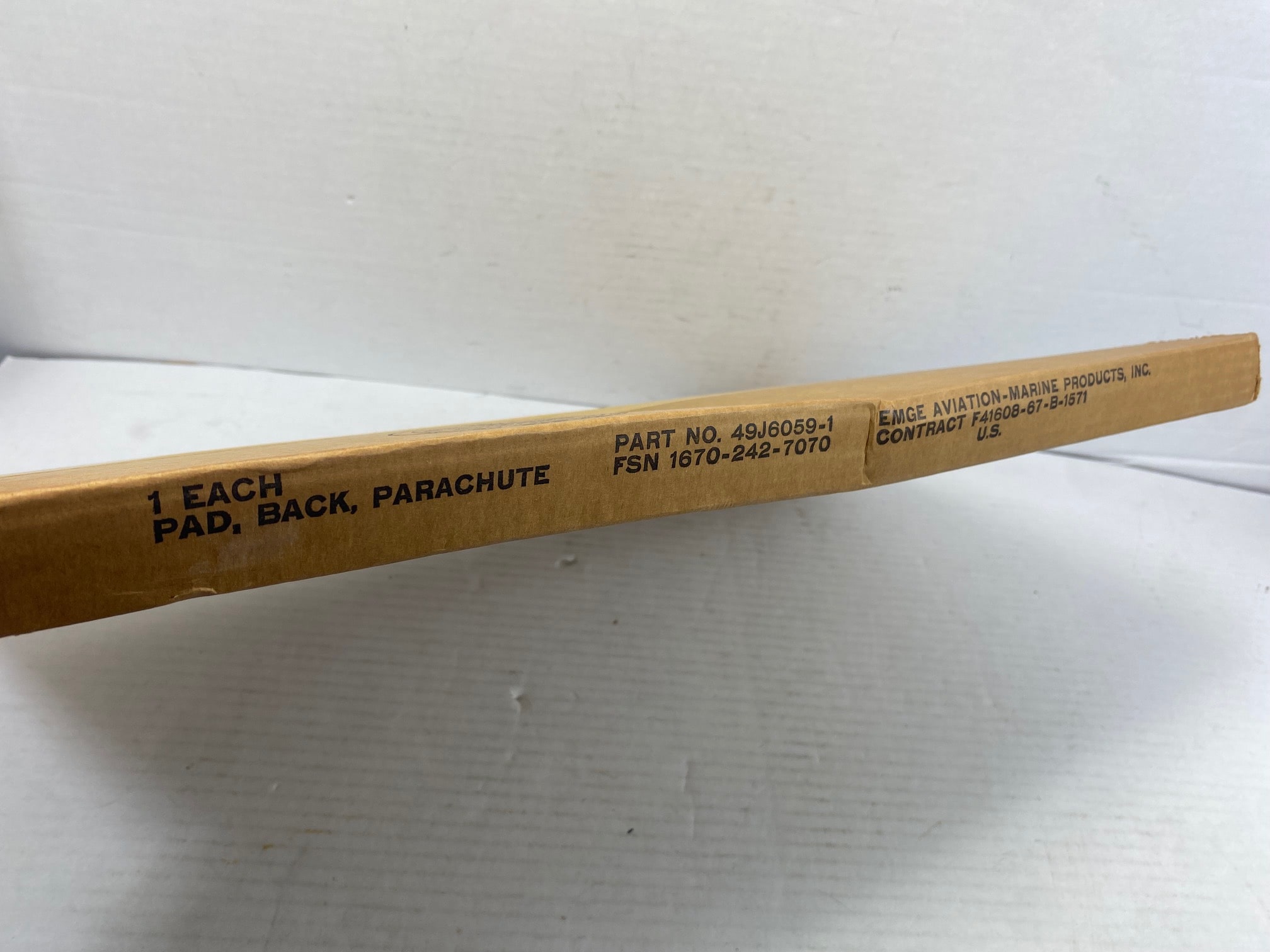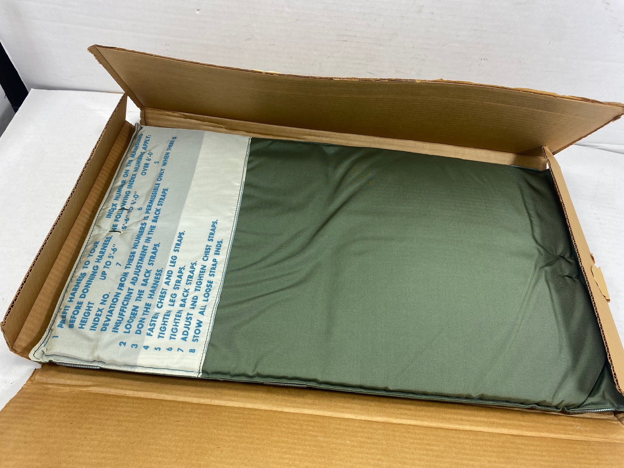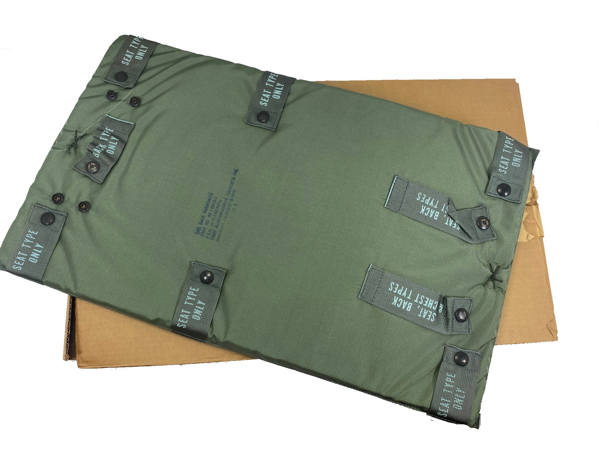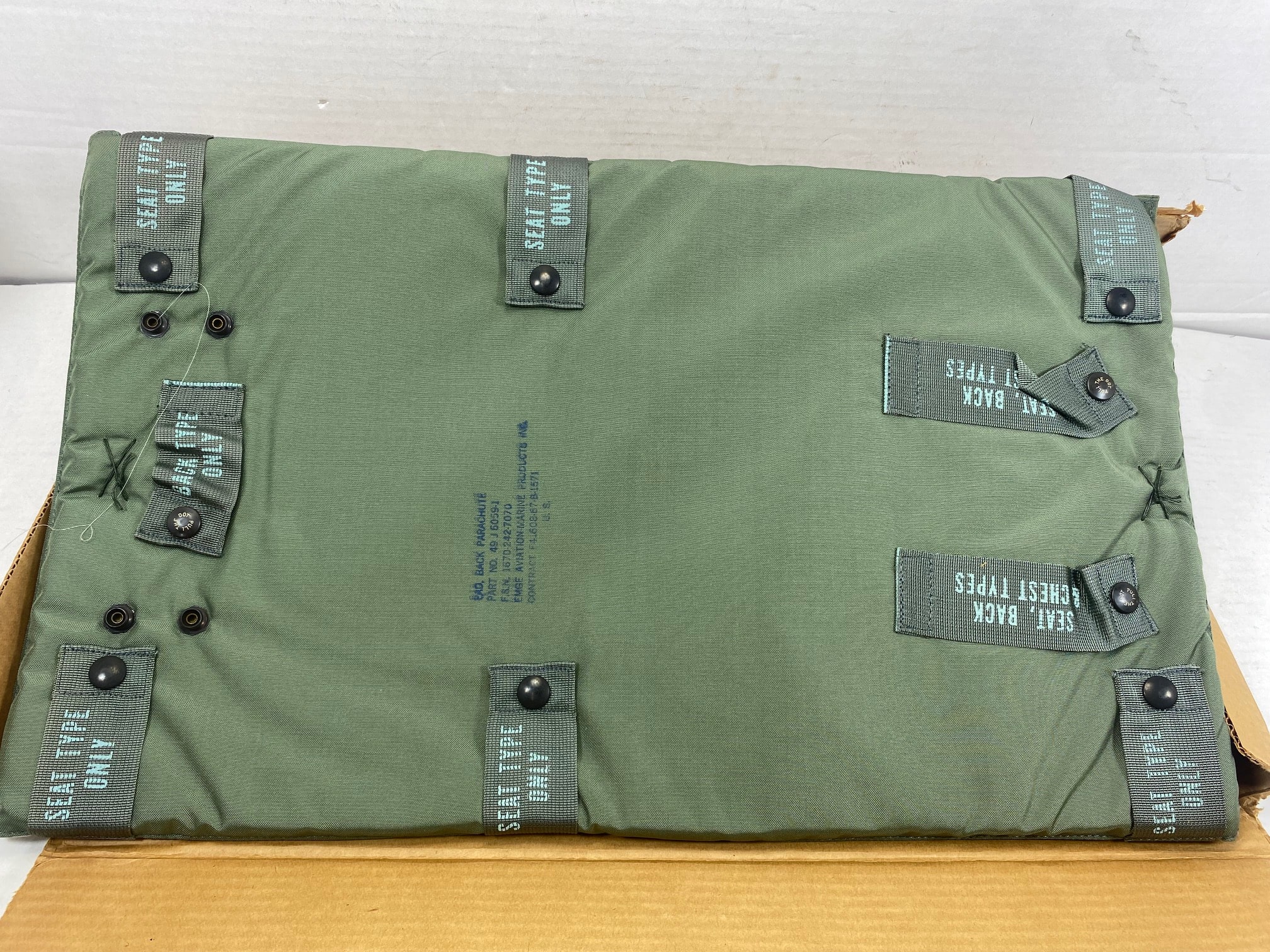 Backpads Parachute, Aviation parachute seat backpad. New old stock in original govt. box. Padding is good.