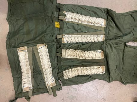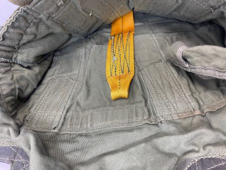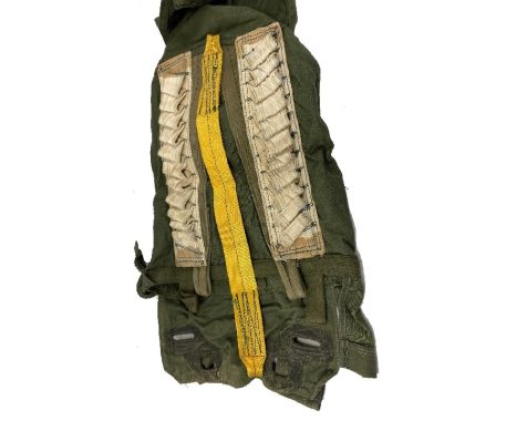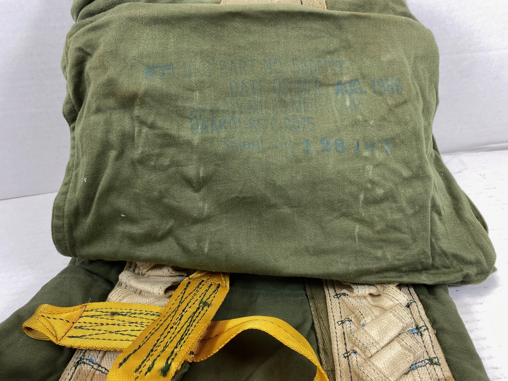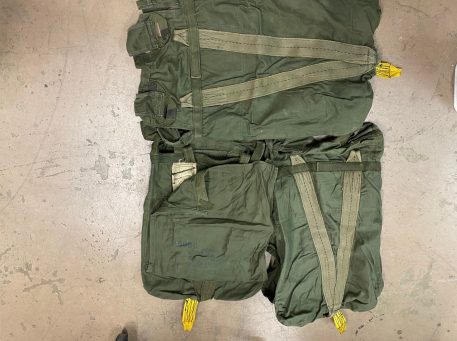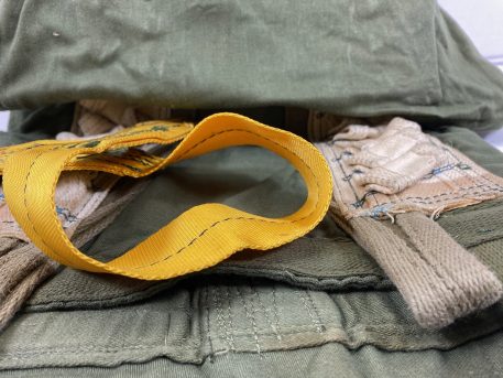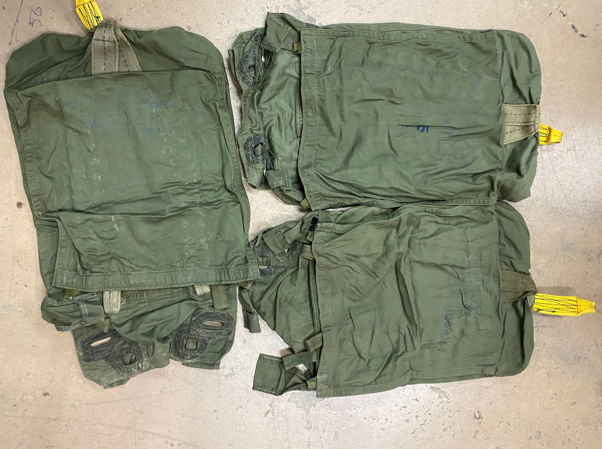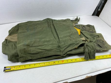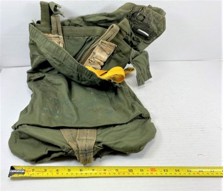 When you see file footage of a parachutist clipping in a yellow line to the aircraft before he jumps, you’ll know what this bag is. Part no. 56D6276. 1970’s and 80’s dated. This style of the bag though does not have the static lines. They will need to be re-purpose into another type of carrying bag or find a way to connect a line to them. Discounted as such.