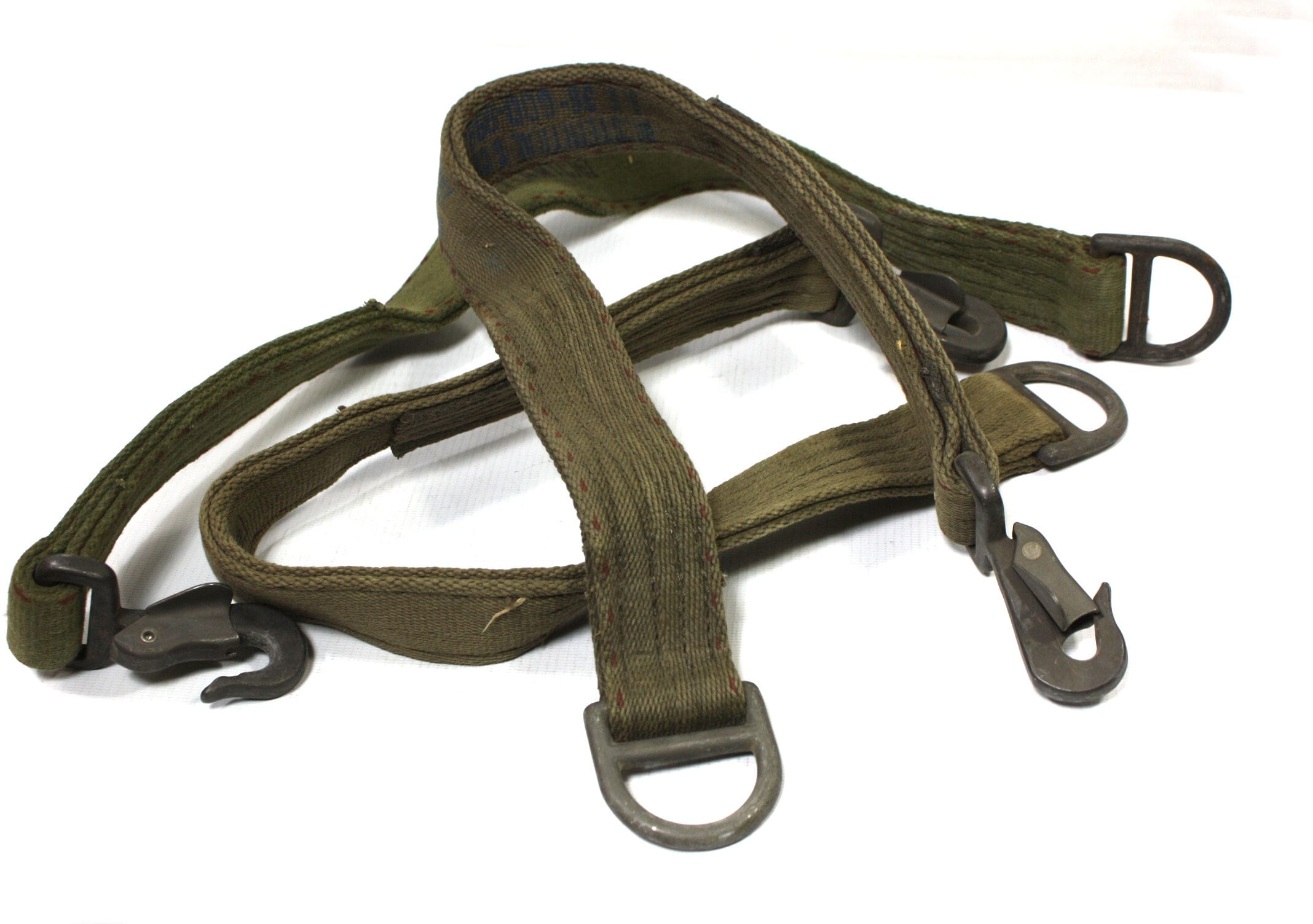 Cotton parachute equipment strap. New old stock. About 1 3/4″ in width and 30″ long. Male snap fastener at one end and D receiver at the other. Not sure which part of the aviators parachute rig this strap fits. Miscellaneous manufacturers and stamps and color shades. Not dated anywhere that we can see. Weighs about 1 1/2 pounds. Price is for 1 strap