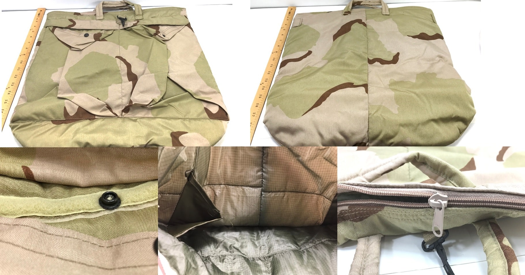 Pilot helmet bag. Padded nylon construction with heavy plastic zipper. Features 2 exterior pockets with hook and loop/ button closures. 20″ x 20″. New. Everyone calls this the helmet bag. Used by military aircraft pilots to keep the flight helmet, headset, oxygen masks and other essential personal aviator gear in one handy bag. We sell these to military surplus enthusiast for all sorts of uses. Makes a great paintball gun bag. These are reproductions, quality is fair.