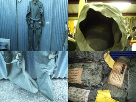 This suit protects airmen from the very cold waters. Made of ballistic rubber-coated nylon. Although these flightsuits were manufactured in the 60’s, most of all the rubber is still live and pliable. The specialized water-proof zipper is very hard to operate. In addition, the flightsuit comes complete with Inflatable Hood and stow-a-way carry bag. Sold as is no returns or exchange. Good for prop or novelty only.