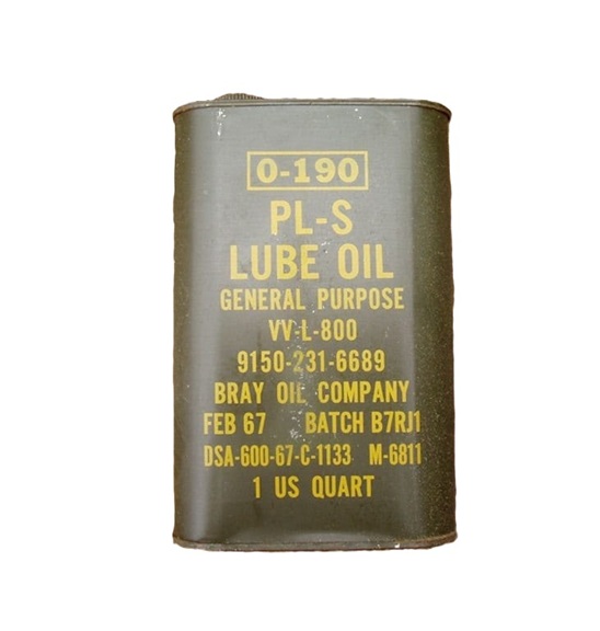 PL-S military lube oil. Original Vietnam dated weapons oil, general purpose NATO code 0-190. US G.I. gun oil.