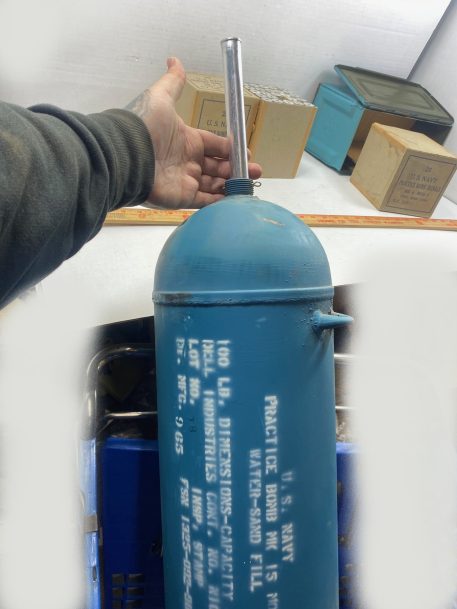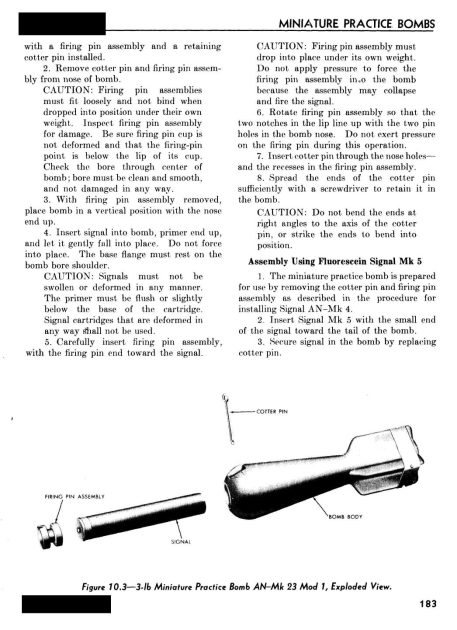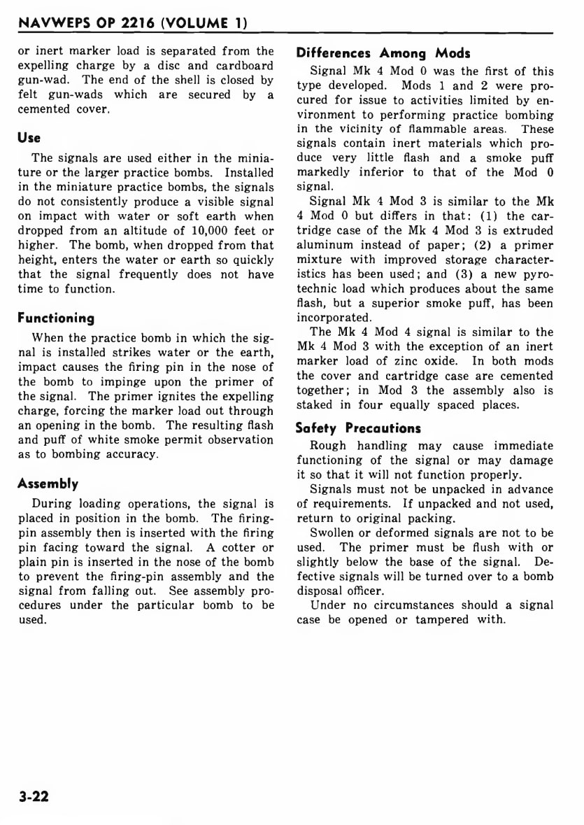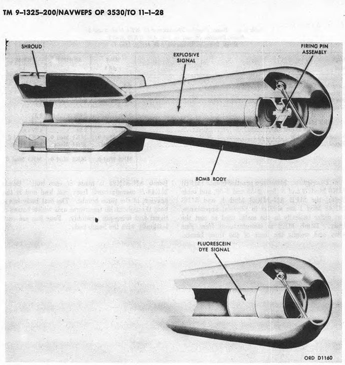 When the practice bomb in which the signal is installed strikes water or the earth, impact causes the firing pin in the nose of the bomb to impinge upon the primer of the signal. The primer ignites the expelling charge, forcing the marker load out through an opening in the bomb. The resulting flash and puff of white smoke permit observation as to bombing accuracy.
