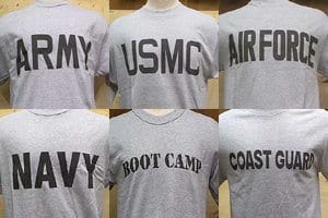 PT T-shirts, grey with black screen print of your favorite service. ARMY, USMC, NAVY, AIR FORCE, BOOTCAMP, and COASTGUARD.