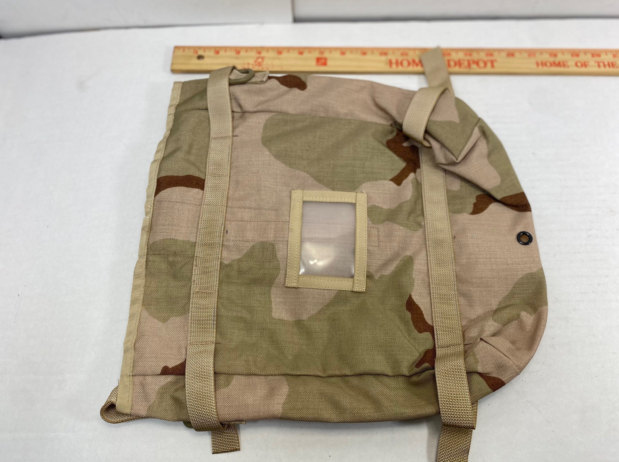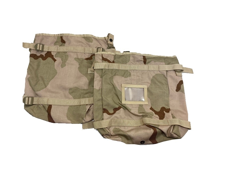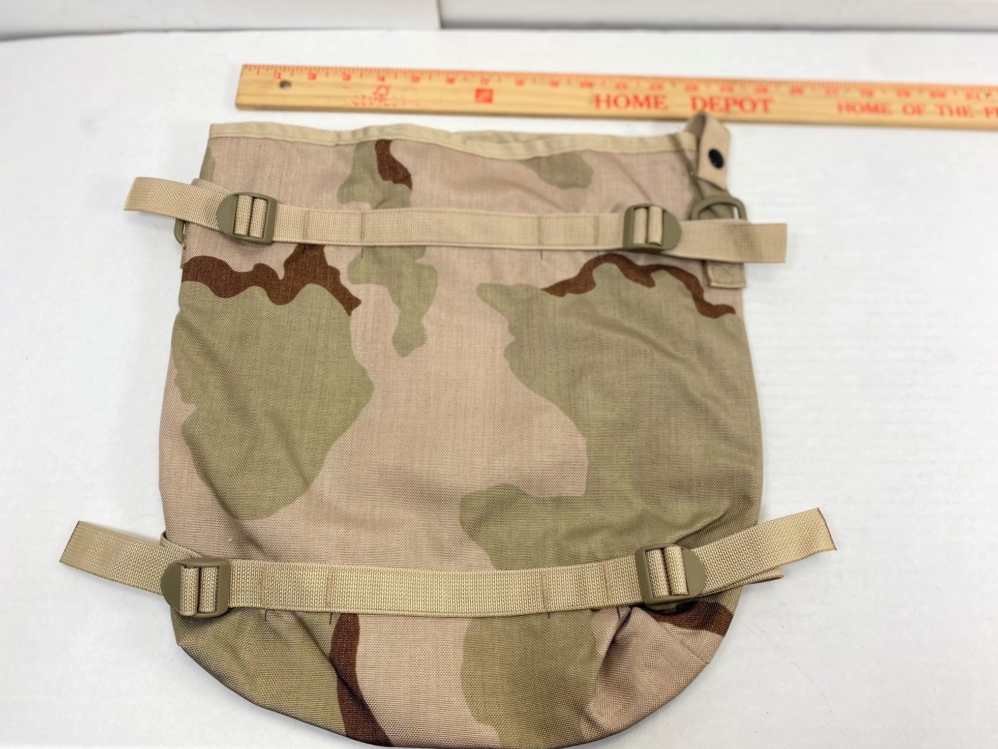 US Military Issue radio pouch in 3-color desert camoflage. Rectangular pouch with open top measures 13″ x 11″ x 3″. Made for securing a radio system inside of the MOLLE II main pack, this pouch has attachment straps on two sides for that purpose, and an adjustable nylon strap/plastic buckle harness inside of the pouch compartment. This listing is for a 10 PACK of radio bags.