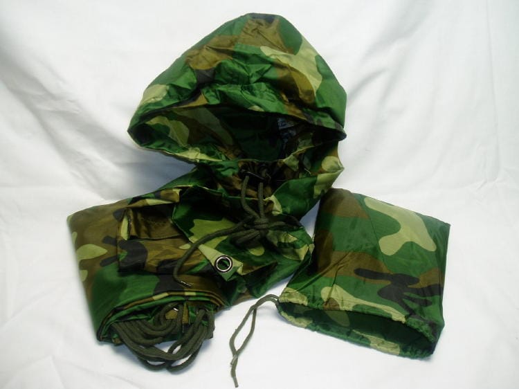 Rain poncho. Nylon ripstop reproduction of the military poncho. New and in woodland color with draw string grommets and arm snaps, just like the us rain poncho. About 80″ x 54″ when laid out flat.