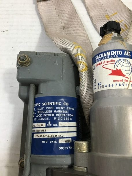 Inertia lock power retractor for aircraft shoulder harness. Manufactured in 1971 by Pacific Scientific. All are used but have been repacked and yellow labeled as serviceable. Sold individually per reel.
