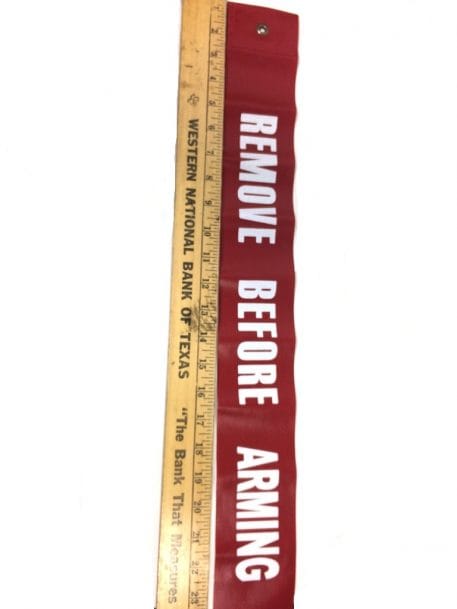 Military personnel would use these warning streamers for safety precautions. The removal of this tag would ensure checks were made on weapons before arming them. The tag’s measurements are approx 3″ x 24″. (flat) The REAL Remove Before Arming Tag. The tags are new old stock genuine surplus, new condition in package.