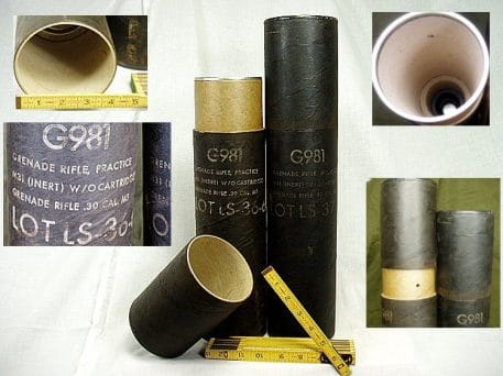 M-31 INERT. W/OUT CARTRIDGES. Rifle Grenade Tube. Made of heavy duty military grade tar paper pressed fiber. Tube to hold practice rifle grenade 30cal. M3. 4″ DIAMETER X 18 ” LONG. These are heavy.