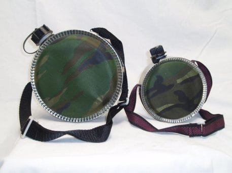Cheap plastic canteens with a metal surround. Camouflage round shoulder-carry canteen 24 oz or 2 quart